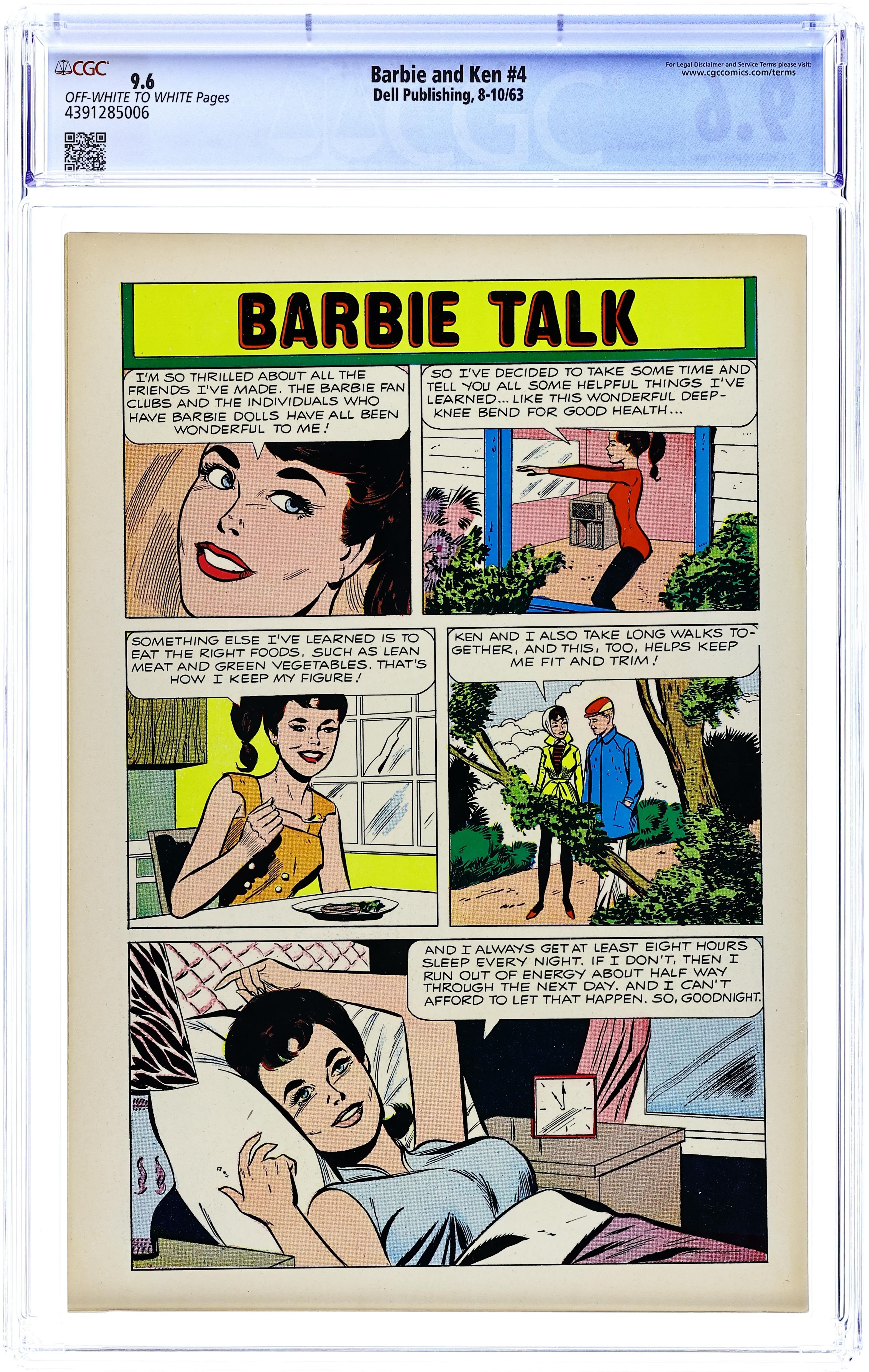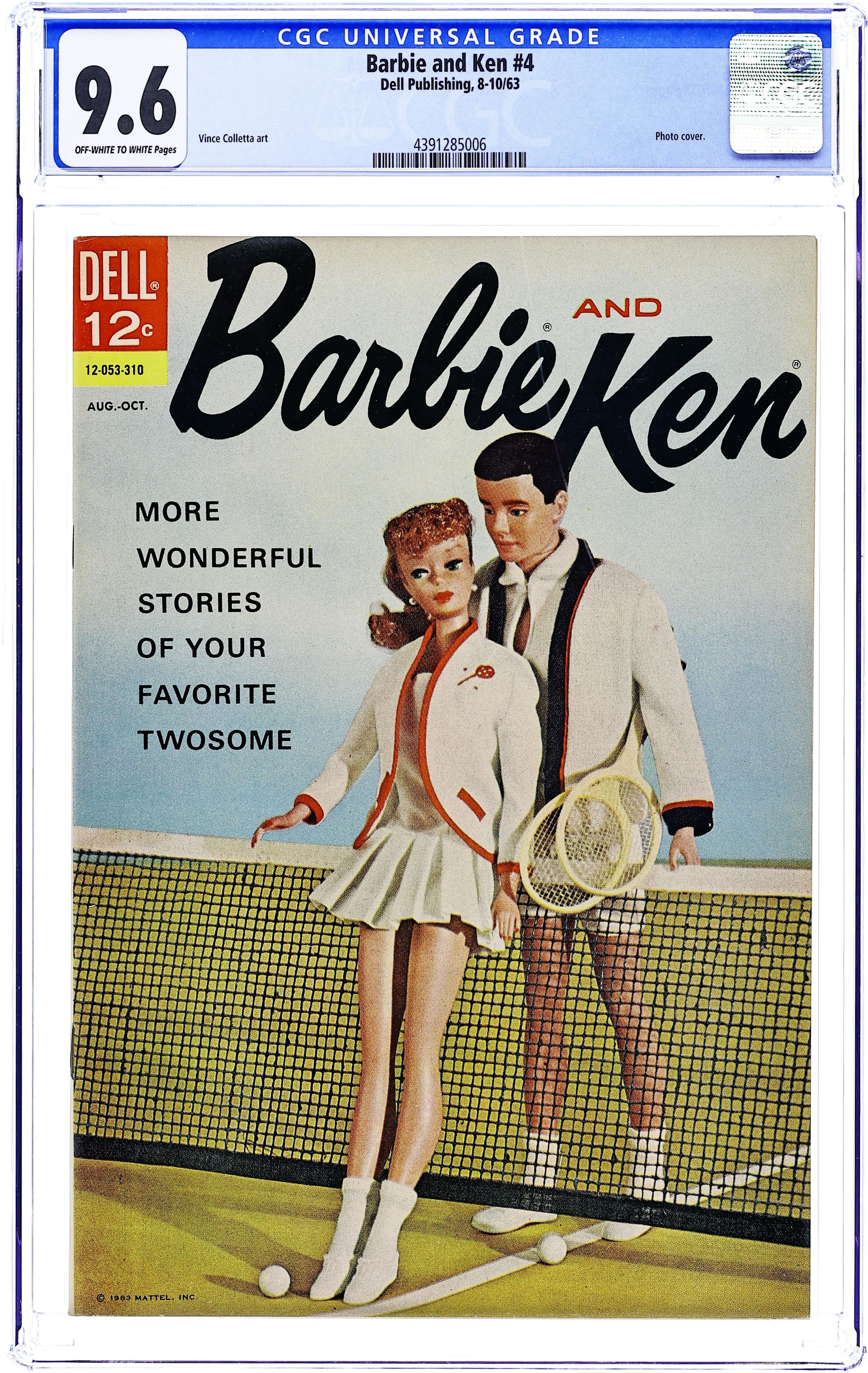 Art by Vince Colletta and others. Cover number is #12-053-310. Dell creates the first comic book based on the popular Barbie and Ken dolls. Members of the Barbie Fan Club discuss their imaginary adventures with Barbie and Ken. Julie goes riding with Ken and Barbie on Barbie's dude ranch ("the Bar-B Ranch"). Mavis gets a close look at 1960s-era television production when Barbie works as a "weather girl." Wilma goes deep-sea diving with Barbie and Ken. Plus one-pagers about living healthy and a typical day in Barbie's world. Anytime, Anywhere; Barbie & Ken; A Typical Day; Barbie Talk. 32 pages, Full Color. Cover price $0.12. Grade: CGC 9.6 explanation of grade Condition: Used (collectible)