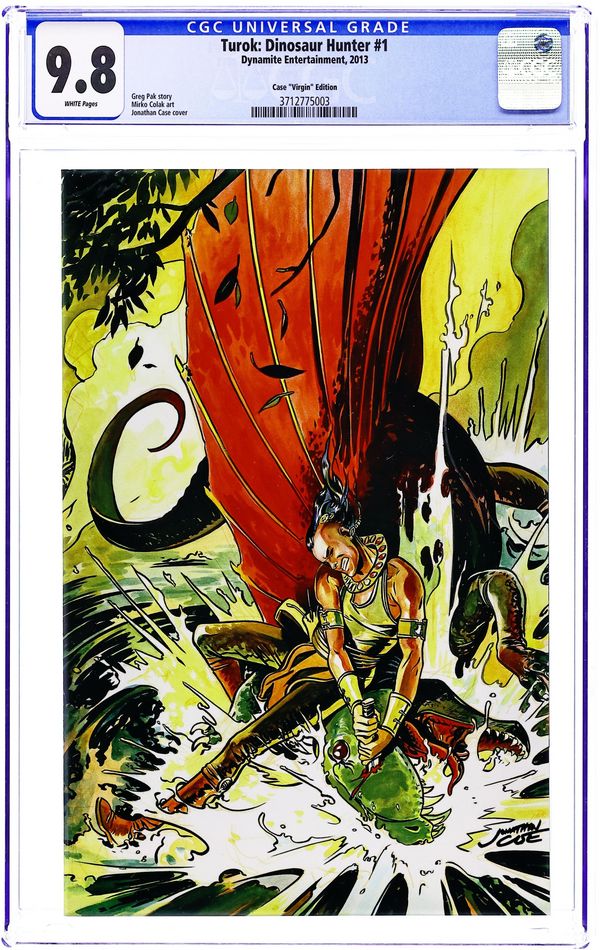 Ended Jul 18 2025 Bid History 4 bids Winning Bid $12 Virgin Cover by Jonathan Case - limited to 25 copies. Written by Greg Pak. Art by Mirko Colak. THE GOLD KEY UNIVERSE BEGINS HERE! Classic Characters by some of Comics Hottest Creators! - Magnus, Solar, Turok and Dr. Spektor! Dynamite is proud to present an all-new adventure ongoing from superstar GREG PAK (Batman/Superman, World War Hulk) and incredible artist MIRKO COLAK (Red Skull: Incarnate, Conan)! Shunned from his tribe, a young Native American named Turok fights to survive, making a lonely life for himself in the unforgiving forest. But his hard-won cunning and survival skills face the ultimate test when man-eating THUNDER LIZARDS attack his people! Why are dinosaurs here? How have they survived? And will Turok use his abilities to save a society that's taken everything away from him? Cover price $3.99. Grade: CGC 9.8 explanation of grade Condition: Used (collectible)