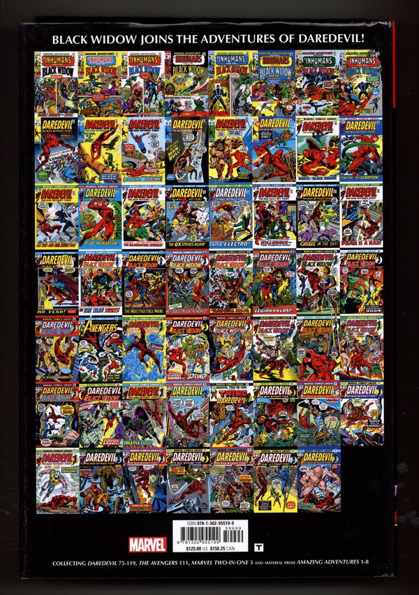 Volume 3 - 1st printing. Collects Daredevil (1964-1998 1st Series) #75-119, The Avengers (1963-1996 1st Series) #111 and material from Amazing Adventures (1970 2nd Series) #1-8. Written by Gerry Conway, Steve Gerber, Gary Friedrich, Mimi Gold, Roy Thomas, Steve Englehart, Chris Claremont, and Tony Isabella. Art by Gene Colan, Don Heck, Bob Brown, John Buscema, Alan Weiss, Barry Windsor-Smith, Sam Kweskin, Rich Buckler, Syd Shores, Jim Starlin, Sal Buscema, John Verpoorten, Tom Palmer, Jack Abel, Bill Everett, Ernie Chan [as Ernie Chua], Mike Esposito, John Tartaglione, Frank Giacoia, Sal Trapani, Don Perlin, Paul Gulacy, Joe Sinnott, Frank Chiaramont, Jim Mooney, and Vince Colletta. Cover by John Romita, Sr. Here come Daredevil and the Black Widow! When Natasha Romanoff enters Matt Murdock's life, one of the greatest eras in the history of the Man Without Fear begins. This massive Omnibus presents their action-packed adventures together - scripted by Gerry Conway and Steve Gerber, and featuring the iconic art of Gene Colan! But the Widow's entrance means a rocky road for Matt Murdock and Karen Page. A relocation to San Francisco will cement Matt's choice and open up a new world of adventure - with villains like Electro, Killgrave the Purple Man and Mister Fear in tow! There's also a crossover adventure with the Avengers and X-Men, and a fight with Kraven the Hunter that turns cosmic! Enter: Moondragon - who mistakes DD for a thrall of Thanos! Hardcover, 8 1/2-in. x 11-in., 1,160 pages, full color. Rated T Cover price $125.00. Grade: VF+ 8.5 explanation of grade Condition: Used (collectible)