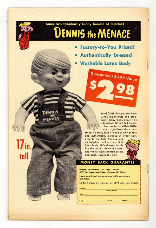 Ended Jul 28 2025 Bid History 8 bids Winning Bid $29 Cover art by Hank Ketcham. Reprints of daily Dennis the Menace cartoons by Ketcham. Fun House, script by Fred Toole, art by Al Wiseman. Dennis and the Lemon, script by Fred Toole, art by Al Wiseman. With Cape and Sword text story. Screamy Mimi; Mimi's yelling causes cakes to fall. Star Gazing starring Dennis the Menace, script by Fred Toole, art by Al Wiseman. Here's a Coloring Page for You to Work On! Po$t No Bill$ starring Dennis the Menace, script by Fred Toole, art by Al Wiseman. 36 pgs. $0.10. Cover price $0.10. Grade: VG/FN 5.0 explanation of grade Condition: Used (collectible)