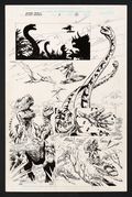 It doesn't get much cooler than this, True Believers! Dr. Doom wielding the Power Cosmic slaughters the beasts of a jungle and gives new life to the dinosaur fossils buried in the ground, gliding over them and admiring his newfound power. It appears however that even resurrecting a species extinct for eons isn't enough as Doom quickly grows bored, wiping out the creatures as quickly and easily as raised them. An absolutely magnificent page and a great showcase for Doom! Pencil and ink on Marvel Comics art board. 11 1/4" x 17 1/4".