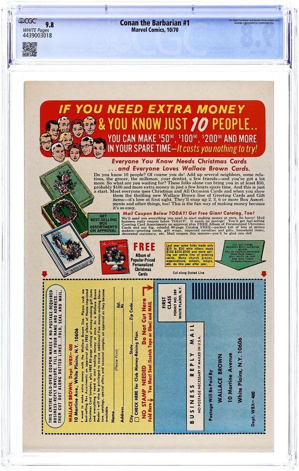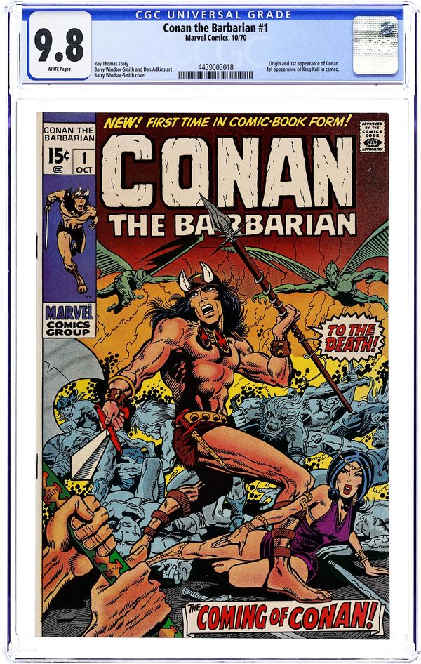 Cover pencils by Barry Windsor-Smith, inks by John Verpoorten. First comic book appearance and origin of Conan. The Coming of Conan!, script by Roy Thomas, pencils by Barry Windsor-Smith, inks by Dan Adkins; Conan battles at Vanaheim and sees his future; Tara returns to her dimension 1st comic book appearance of Kull (cameo). The letters page contains a map of Conan's world of the Hyborian Age drawn by Windsor-Smith (based on Robert E. Howard's own version) and a short essay on The World of Conan. 36 pgs. Cover price: $0.15. Cover price $0.15. Grade: CGC 9.8 explanation of grade Condition: Used (collectible)
