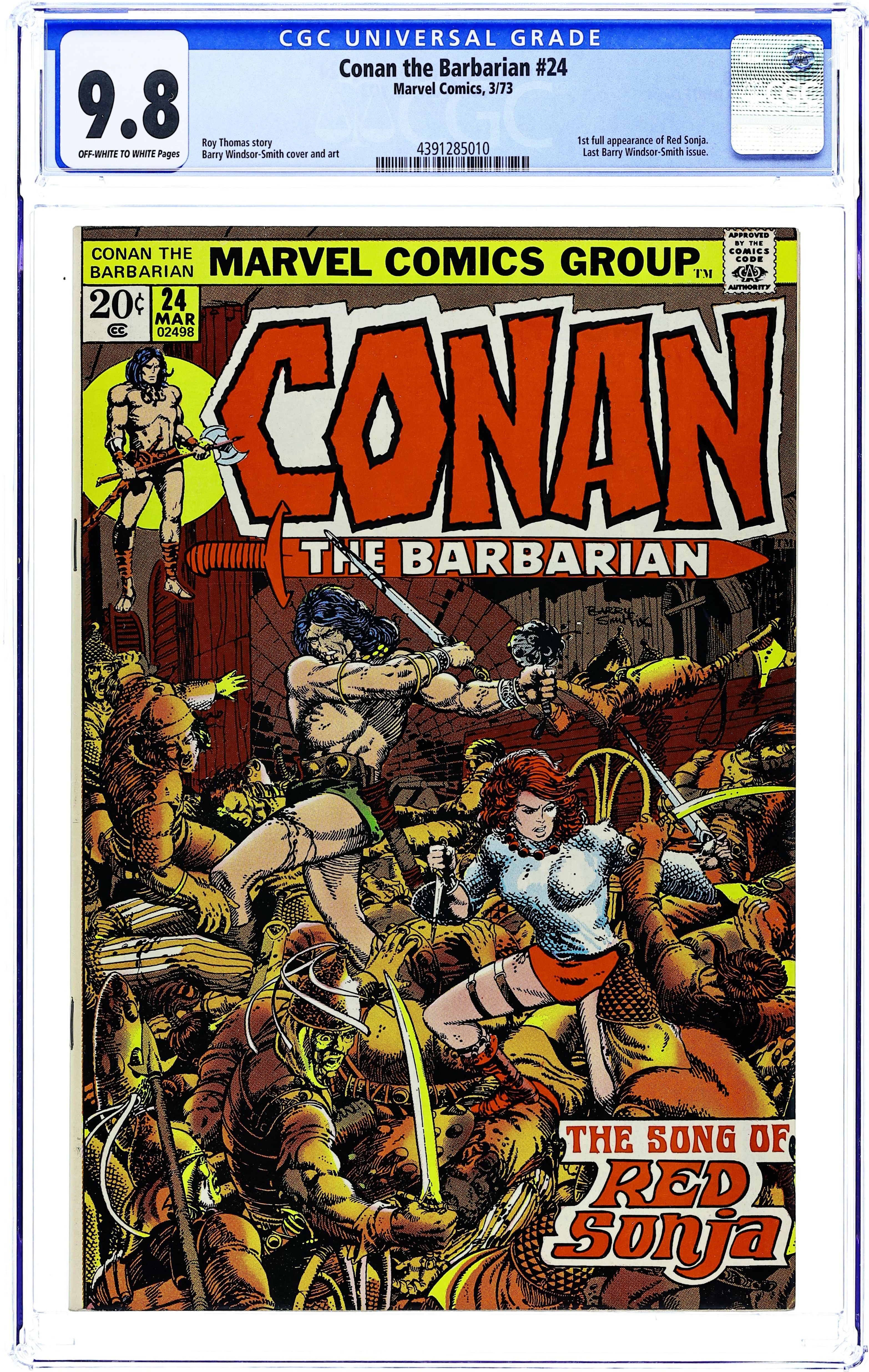 Cover art by Barry Windsor-Smith. First full Red Sonja story, The Song of Red Sonja, script by Roy Thomas, pencils by Barry Windsor-Smith; setting: Makkalet; Conan and Red Sonja start a bar-fight, bathe in a fountain, scale temple walls, break in and steal a snake-tiara, and fight a magical snake; at the end Sonja tricks Conan, and leaves for Pah-Disha; the Red Sonja story continues in Savage Sword of Conan 1. Final Windsor-Smith art on this title. The art in this issue (at least on page 8, and perhaps elsewhere) was altered without Windsor-Smith's approval. See Marvel Treasury Edition 15 or Savage Sword of Conan 82 for the original version. (The reprint in Conan Saga 8 contains the altered version). In the letter's column, Roy Thomas responds and announces Barry Smith's final departure as Conan the Barbarian artist; Incidentally, Roy's responses to R. Benitz and Keith Taylor are mistakenly transposed. 36 pgs. Cover price $0.20. Cover price $0.20. Grade: CGC 9.8 explanation of grade Condition: Used (collectible)