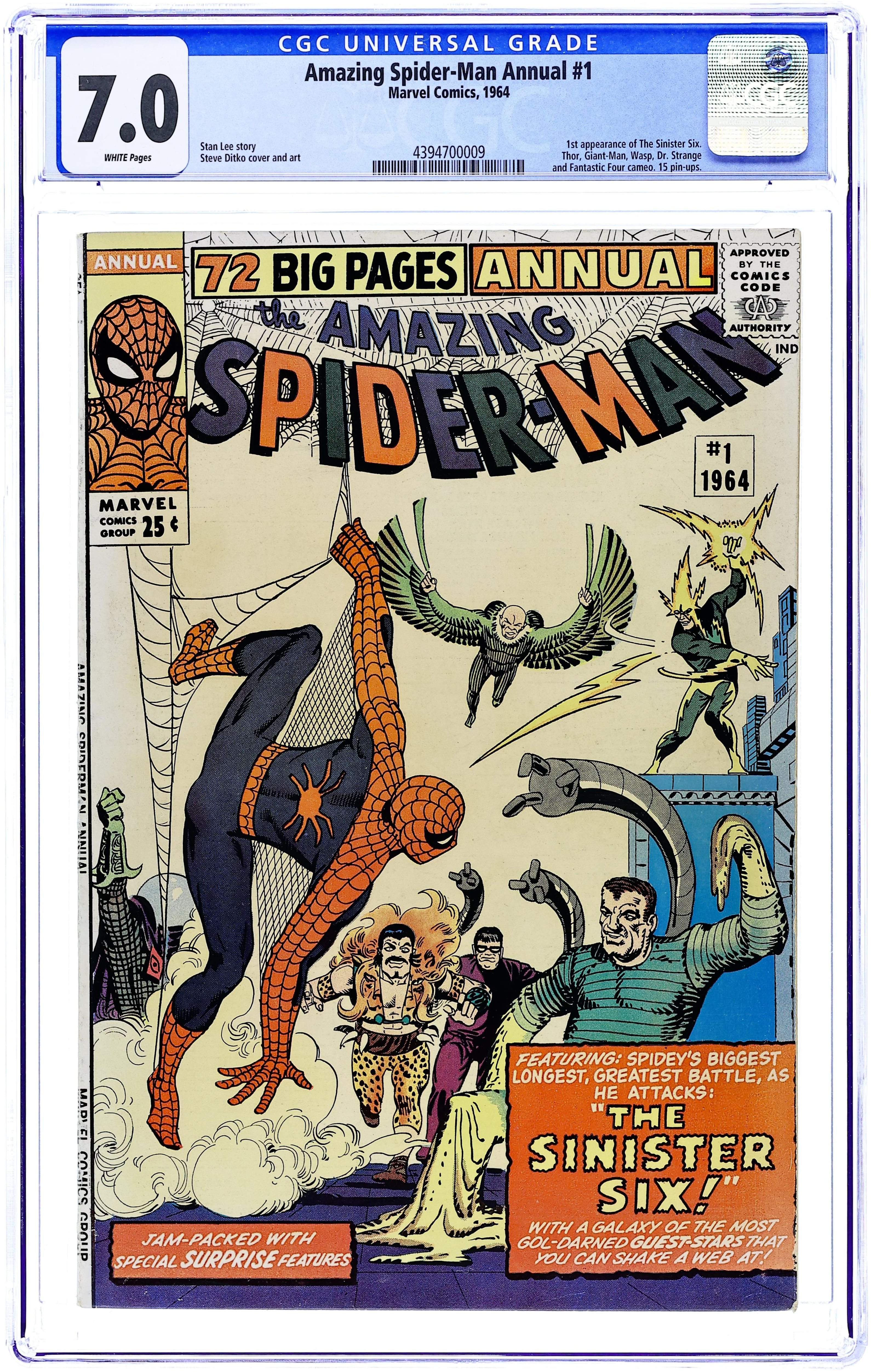 Cover art by Steve Ditko. First appearance of the Sinister Six (Doctor Octopus, Electro, Kraven the Hunter, Mysterio, Sandman, and the Vulture) in a new 41-page story, "The Sinister Six!" Script by Stan Lee, art by Steve Ditko; Dr. Octopus organizes the Sinister Six, composed of other Spider-Man Villains; They capture Betty Brant and Aunt May and force Spider-Man to rescue them. Cameos by the X-Men, the Fantastic Four, Captain America, Thor, Iron Man, Iron Man, Giant Man, and the Wasp. Lots of back-up features (all art by Ditko): 14 pages of pin-ups (Spider-Man's most famous foes); 9-page "The Secrets of Spider-Man"; 3-page "How Stan Lee and Steve Ditko Create Spider-Man!"; and other miscellaneous pin-ups. Giant 76-page issue! Most of this issue reprinted in Marvel Tales # 150. 76 pgs., full color. Cover price $0.25. Grade: CGC 7.0 explanation of grade Condition: Used (collectible)