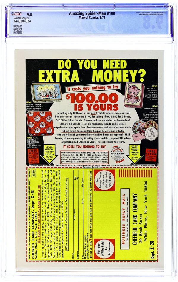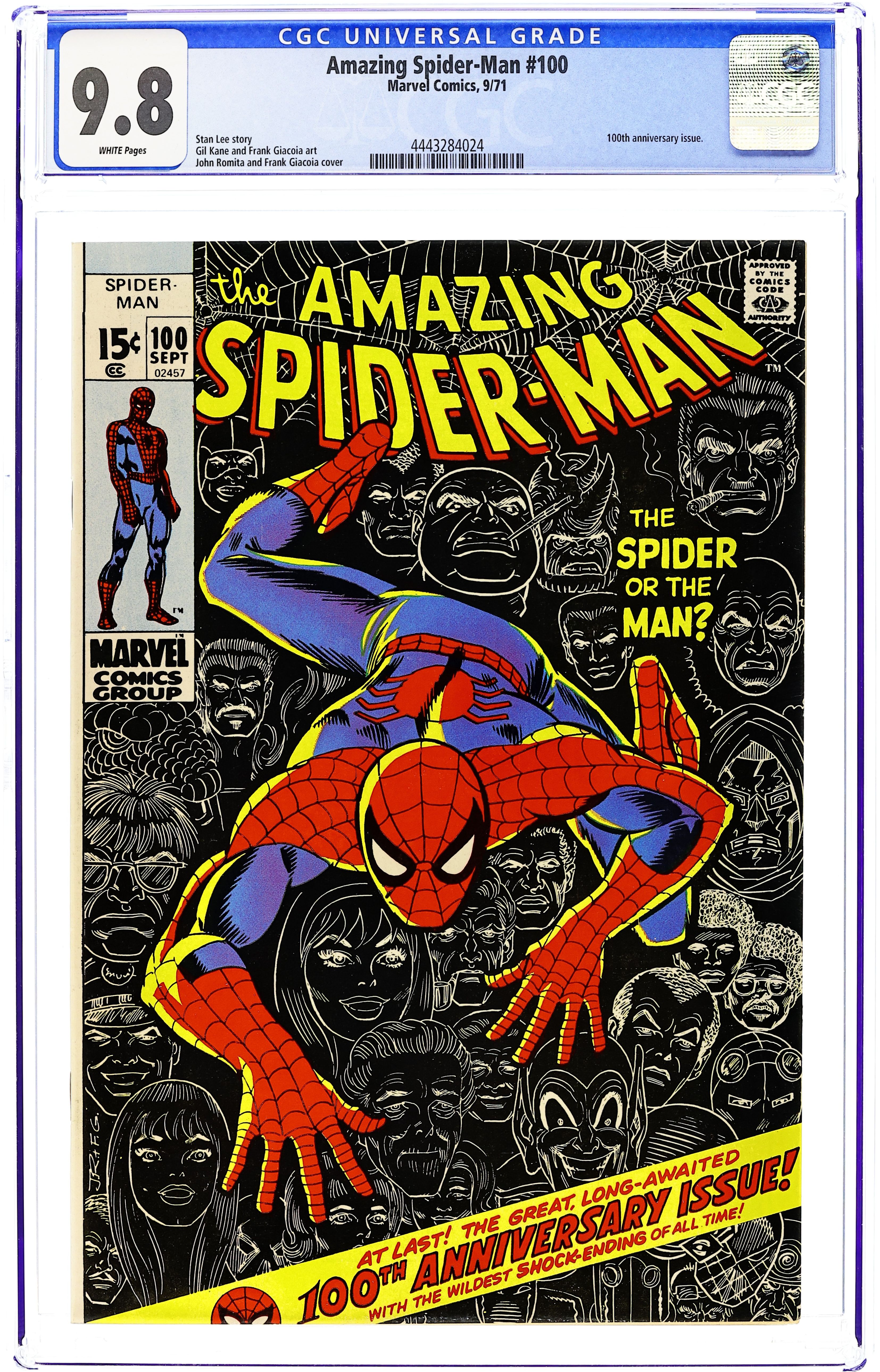 "The Spider of the Man?" Script by Stan Lee. Pencils by Gil Kane. Inks by Frank Giacoia and Tony Mortellaro (backgrounds). Cover by John Romita and Frank Giacoia. It's the 100th anniversary issue of the Amazing Spider-Man title -- with an all-time cover! Peter Parker wants to live a normal life with Gwen Stacy. But he doesn't think he can as long as he has his spider-powers. So, with that thought in mind, the young scientist creates a special potion -- which he believes will eliminate his remarkable abilities. After Peter drinks the potion, he lies down to sleep. And when he wakes up...he gets the biggest shock of his amazing life! Flashback cameos by Aunt May, J. Jonah Jameson, Betty Brant, Gwen Stacy, and Captain Stacy. (Notes: There have been many homages to John Romita's classic cover including the covers to Marvel Tales 100, Ultimate Spider-Man (2000) 100B, and Peter Parker (2017) #1EBAY. This story was reprinted in Marvel Treasury Edition #14 and Marvel Tales 253.) 36 pages. Cover price $0.15. Grade: CGC 9.8 explanation of grade Condition: Used (collectible)