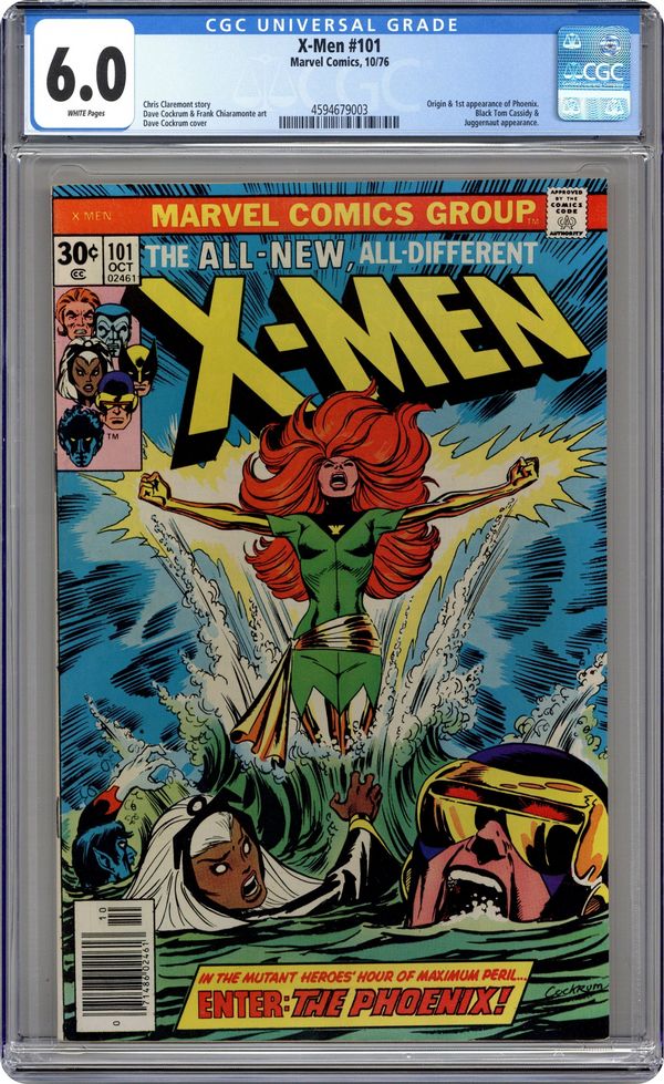 "Like a Phoenix, from the Ashes!" Part 1 of 3. Story by Chris Claremont. Art by Dave Cockrum and Frank Chiaramonte. In the startling aftermath of last issue's events, the X-Men crash-land back on Earth, but they soon learn that a unbelievable change has come over Jean Grey. Don't miss the rise of the Phoenix! Meanwhile, the team decides to take in some much needed R&R. They head to Ireland to Banshee's ancestral home. However, nothing but danger and death wait for them here. 36 pages, full color. NOTE: 1st appearance of Phoenix, 1st appearance of Black Tom Cassidy, and Juggernaut cameo. Cover price $0.30. Grade: CGC 6.0 explanation of grade Condition: Used (collectible)