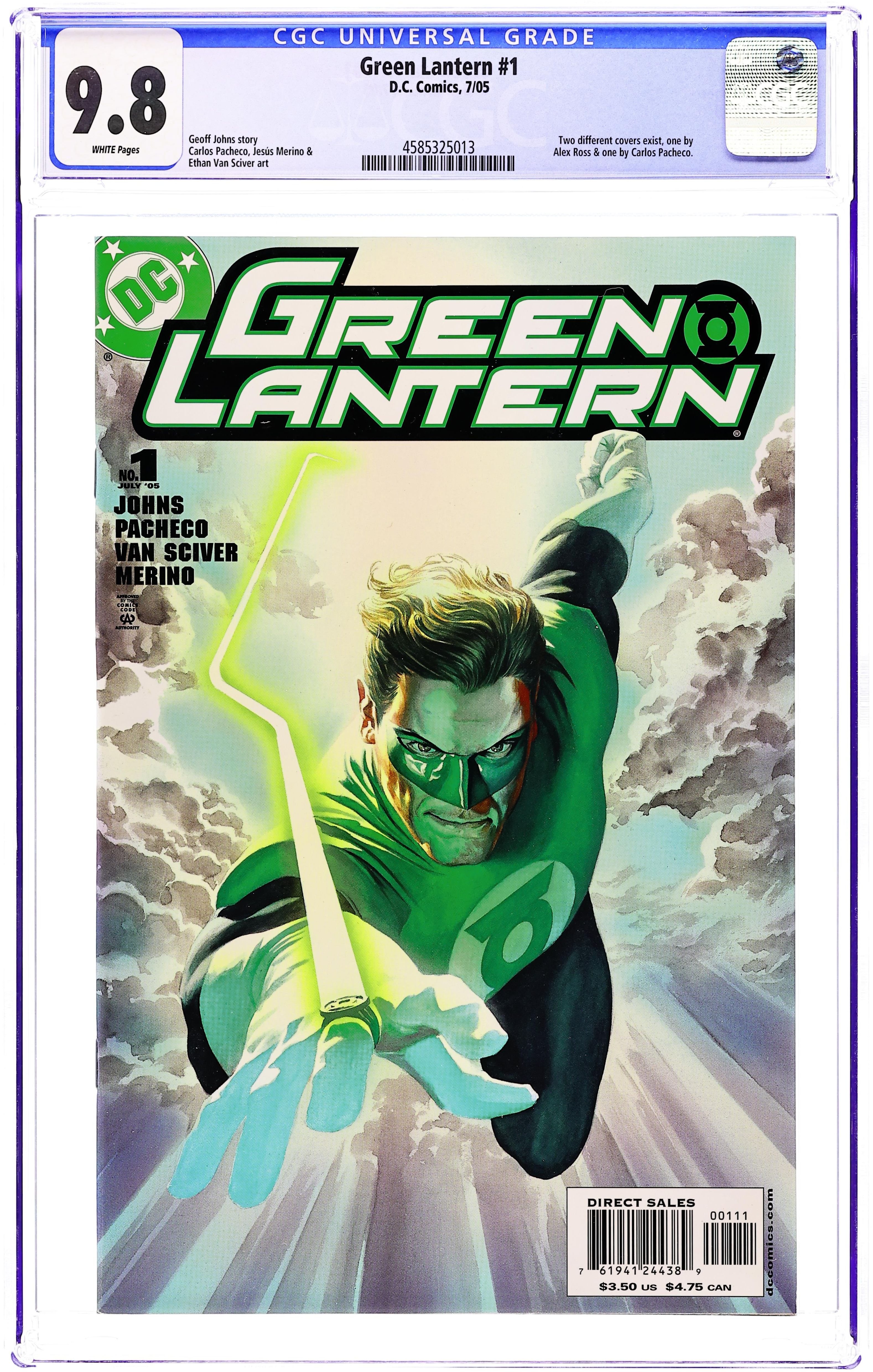 Direct Edition. Variant Cover by Alex Ross. Written by Geoff Johns. Pencils by Carlos Pacheco and Ethan Van Sciver, inks by Jesus Merino and Van Sciver. Strap in and hang on as one of DC's greatest icons, Hal Jordan returns to the forefront of the DCU in a new monthly series by red-hot writer Geoff Johns (TEEN TITANS, THE FLASH) and stunning art by Carlos Pacheco & Jesus Merino (SUPERMAN/BATMAN)! GREEN LANTERN challenges your imagination and leaves you breathless as you witness the adventures of one of the greatest heroes in the DCU. From the runways at Edwards Air Force Base to the darkest corner of Space Sector 2814, the Green Lantern will proudly shine his light! This special 40-page debut issue kicks off the 3-part tale "No Fear." Spinning out of the pages of GREEN LANTERN: REBIRTH, Hal Jordan returns to the DCU as the Emerald Warrior, ready to reclaim his life and the light of the Green Lantern. But the forces of darkness have already begun to rise, looking to claim the power of the Green Lantern for themselves! On sale May 25 ? 40 pg, FC, $3.50 US Edited by Peter Tomasi Cover price $3.50. Grade: CGC 9.8 explanation of grade Condition: Used (collectible)