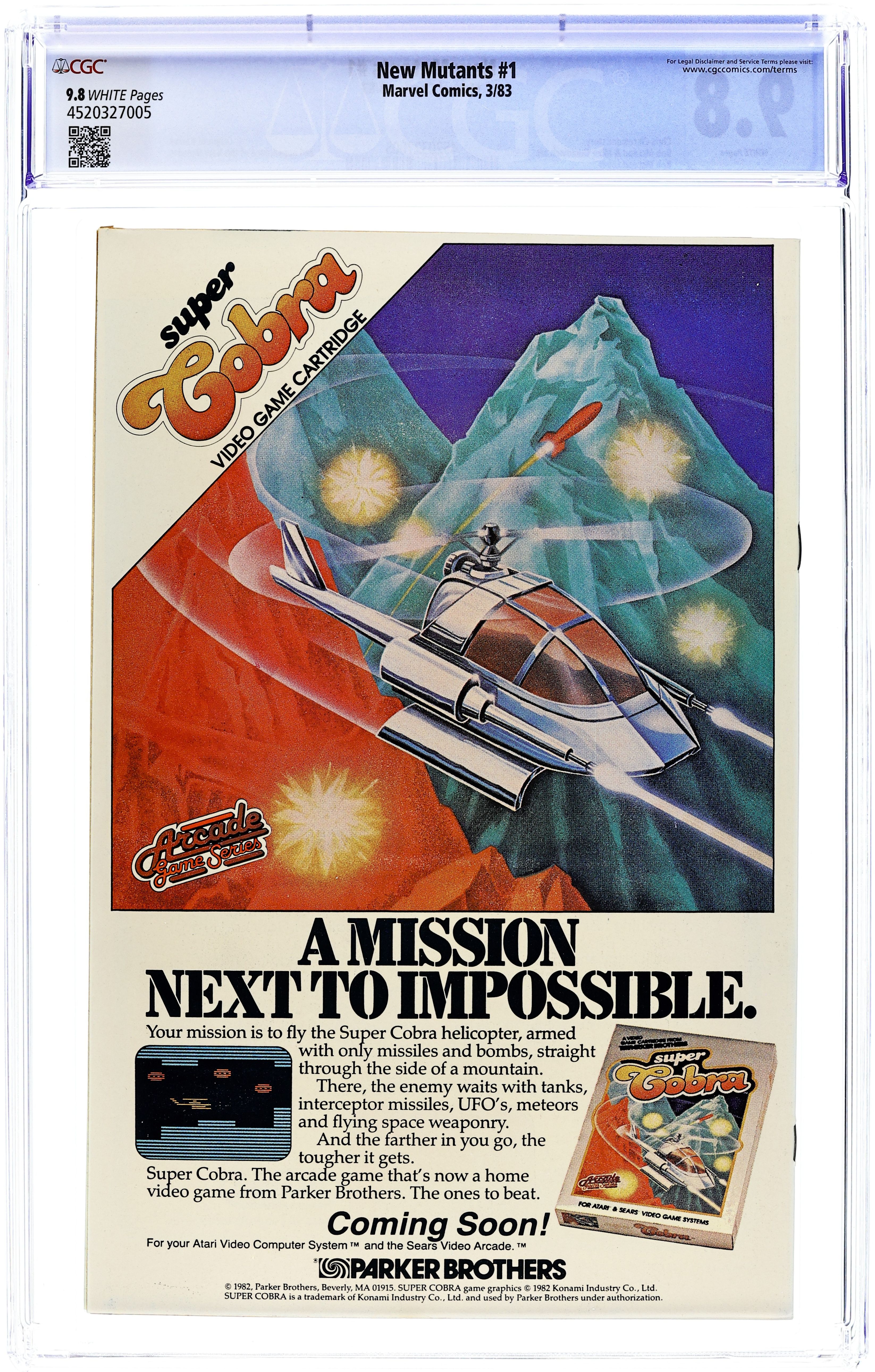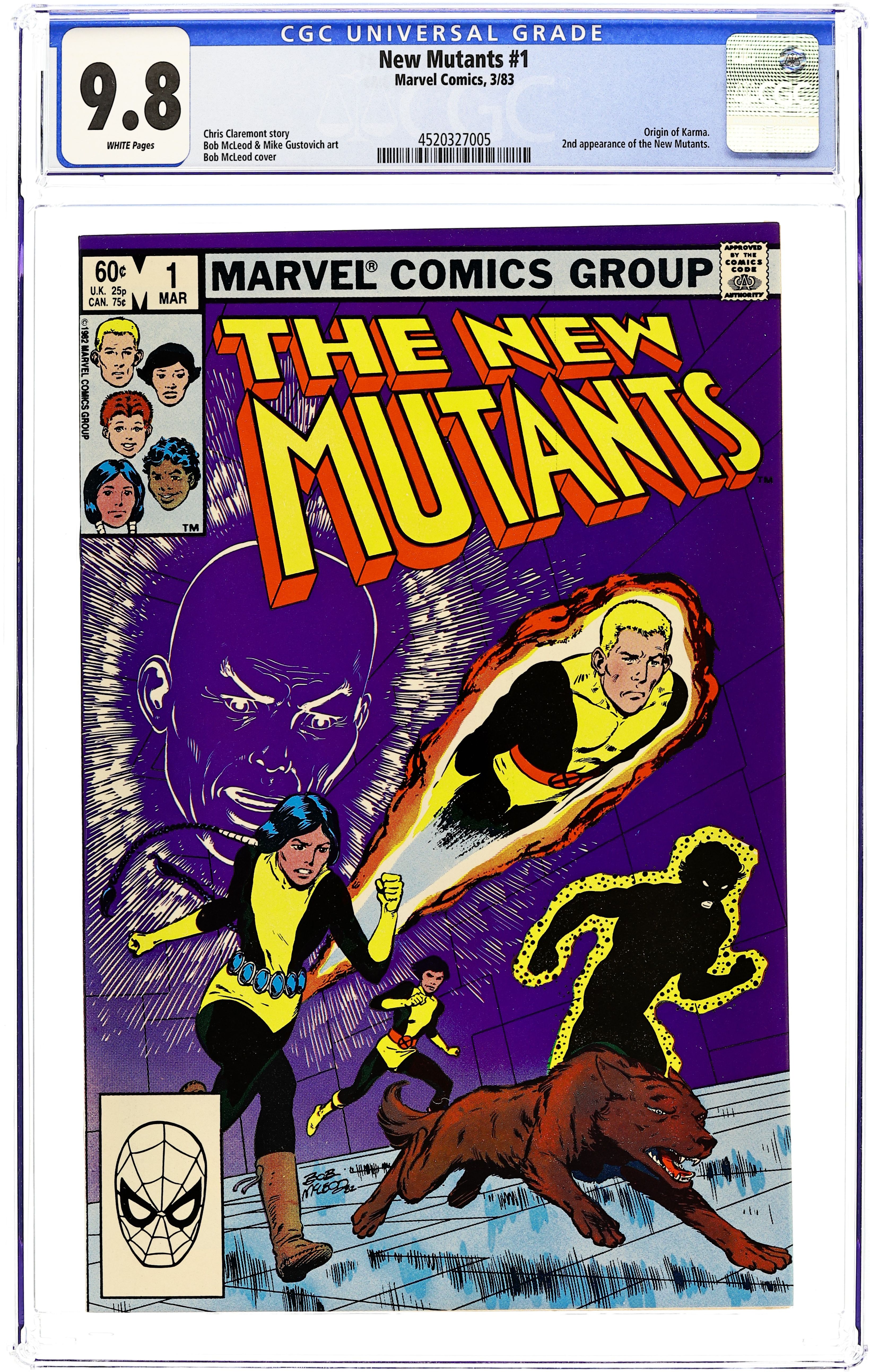 Starts Jan 3 Direct Edition. Regular series begins (first appearance is in Marvel Graphic Novel 4). Cover art by Bob McLeod. Initiation!, script by Chris Claremont, pencils by Bob McLeod, inks by Mike Gustovich; The New Mutants get acclimated to their new home, new talents, new friends, and new teachers, unaware that they are being watched; Moira learns that Professor X has a son; and Psyche is attacked in the Danger Room by an unknown assailant; Origin of Karma. Second appearance of the New Mutants (after Marvel Graphic Novel #4). Cover price $0.60. Grade: CGC 9.8 explanation of grade Condition: Used (collectible)