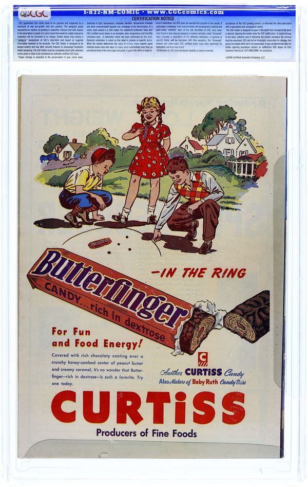 Ended Jul 14 2025 Bid History 11 bids Winning Bid $338 Cover by Al Fagaly. Stories by unknown. Art by Bill Vigoda, Irving Novick and Harry Lucey. A birthday party is today, and Archie has forgotten in "Archie Gets the Bird"! Plus: Veronica brings her bowling ball to Pop Tate's in "All Rolled Up"; Mr Andrews decides to buy a sewing machine for their anniversary in "Sewing Pains"; Charles Foyer, the famous French actor, is in town for one appearance, and Betty and Veronica decide that they need to study for their French exam; Jughead is concerned because it is Friday the 13th, but Archie isn't worried in "The Jinx Buster"; and Veronica needs an idea for a church bazaar booth, and Archie agrees to come up with one in "Dollars To Doughnuts"! Also: 2-page text story "Oil For the Lamps of Archie"! Full color. Cover price $0.10. Grade: CGC 7.5 explanation of grade Condition: Used (collectible)
