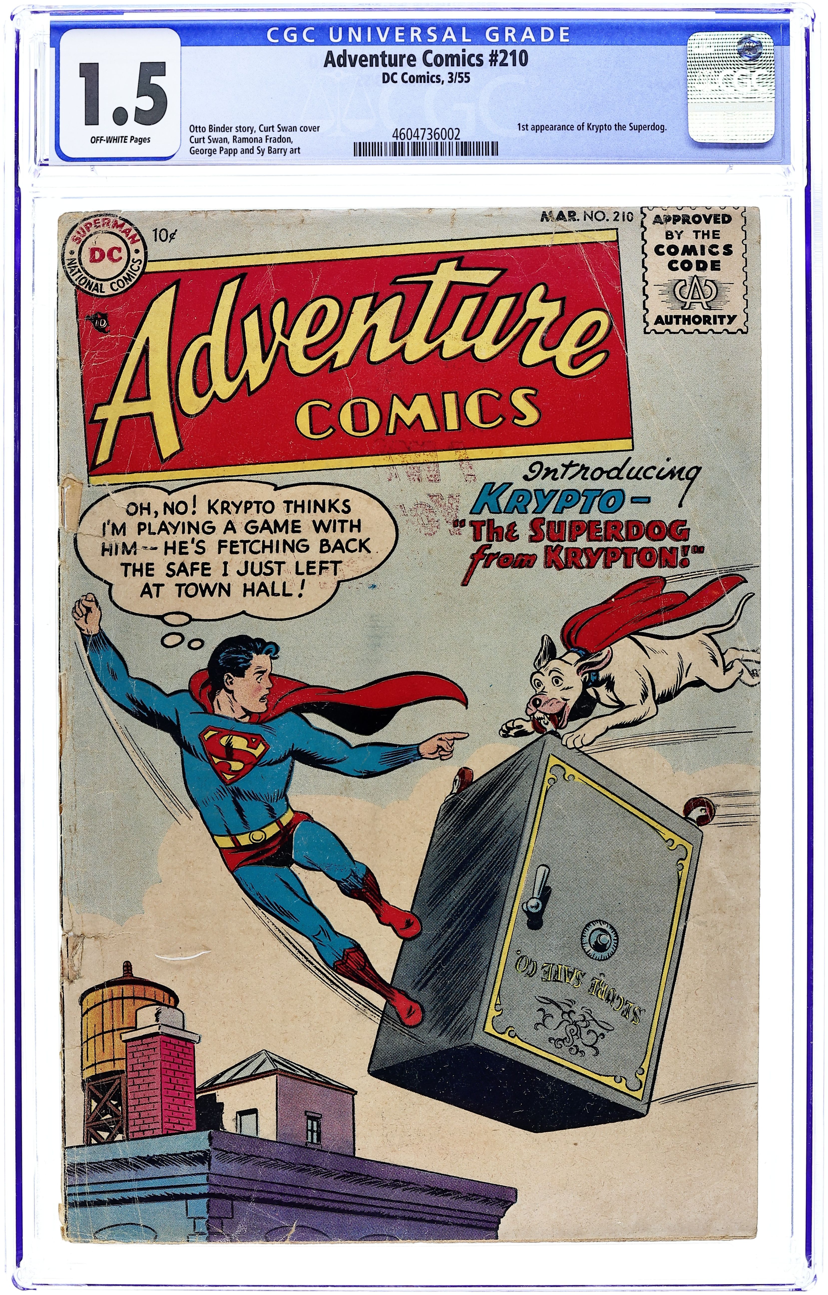 Ended Jul 14 2025 Bid History 33 bids Winning Bid $1,226 Cover pencils by Curt Swan, inks by Stan Kaye. The Super-Dog from Krypton!, script by Otto Binder, pencils by Curt Swan, inks by Sy Barry; A super-powerful dog arrives in Smallville in a rocket complete with written records proving that he is baby Kal-El's puppy who Jor-El used as a test animal when developing his space rockets; Though happy to be reunited with his dog, Superboy needs to make sure that Krypto does not give away his secret identity several times before Krypto leaves for a romp in space. The First Undersea Newspaper starring Aquaman, art by Ramona Fradon. The Defeat of Green Arrow, art by George Papp. Two page text story, They're Striking it Rich Again. 36 pages, Full Color. NOTE: 1st appearance of Krypto the Super Dog. Cover price $0.10. Grade: CGC 1.5 explanation of grade Condition: Used (collectible)