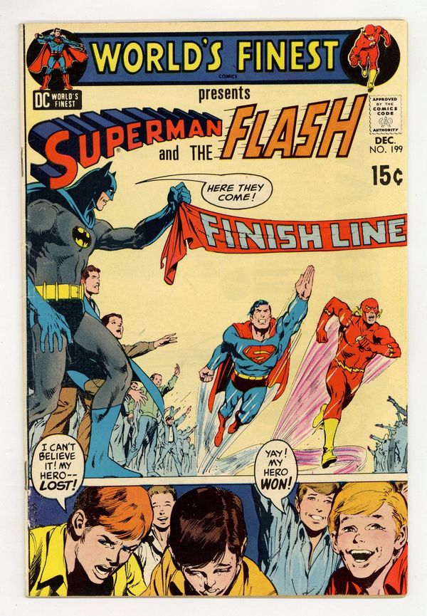 Ended Jul 28 2025 Bid History 12 bids Winning Bid $21 3rd Superman/Flash race (continued from last issue). Cover art by Neal Adams. Race to Save Time starring Superman and Flash, script by Dennis O'Neil, pencils by Dick Dillin, inks by Joe Giella; Superman and Flash race, and the winner is...Small portraits of Carmine Infantino, Joe Kubert, Dick Giordano, and Neal Adams by Adams. 36 Pages, Full Color. Cover price $0.15. Grade: VG+ 4.5 explanation of grade Condition: Used (collectible)