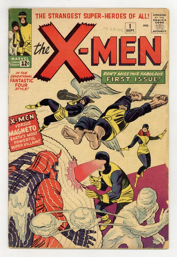Cover pencils by Jack Kirby, inks by Sol Brodsky. X-Men, script by Stan Lee, pencils by Jack Kirby, inks by Paul Reinman; After a day of training and meeting Jean Grey, a new student at Professor X's school, the X-Men go one their first assignment--stopping a mutant named Magneto from talking over an Air Force base. Full page house ads for Amazing Spider-Man #4 and Sgt. Fury and His Howling Commandos #3. This is it, the first issue of the Uncanny X-Men, and even in the beginning, there was Magneto, the Earth's most powerful super villain. Conceived by Stan Lee and Jack Kirby, this first issue will always remain one of the core books within the Marvel Comics mythos. This is Stan and Jack making history and legend, although no one knew it at the time. First appearances of Professor X, Cyclops, Iceman, the Angel, the Beast, Marvel Girl, and Magneto. 36 pgs. $0.12. Cover price $0.12. Grade: GD 2.0 explanation of grade Condition: Used (collectible)