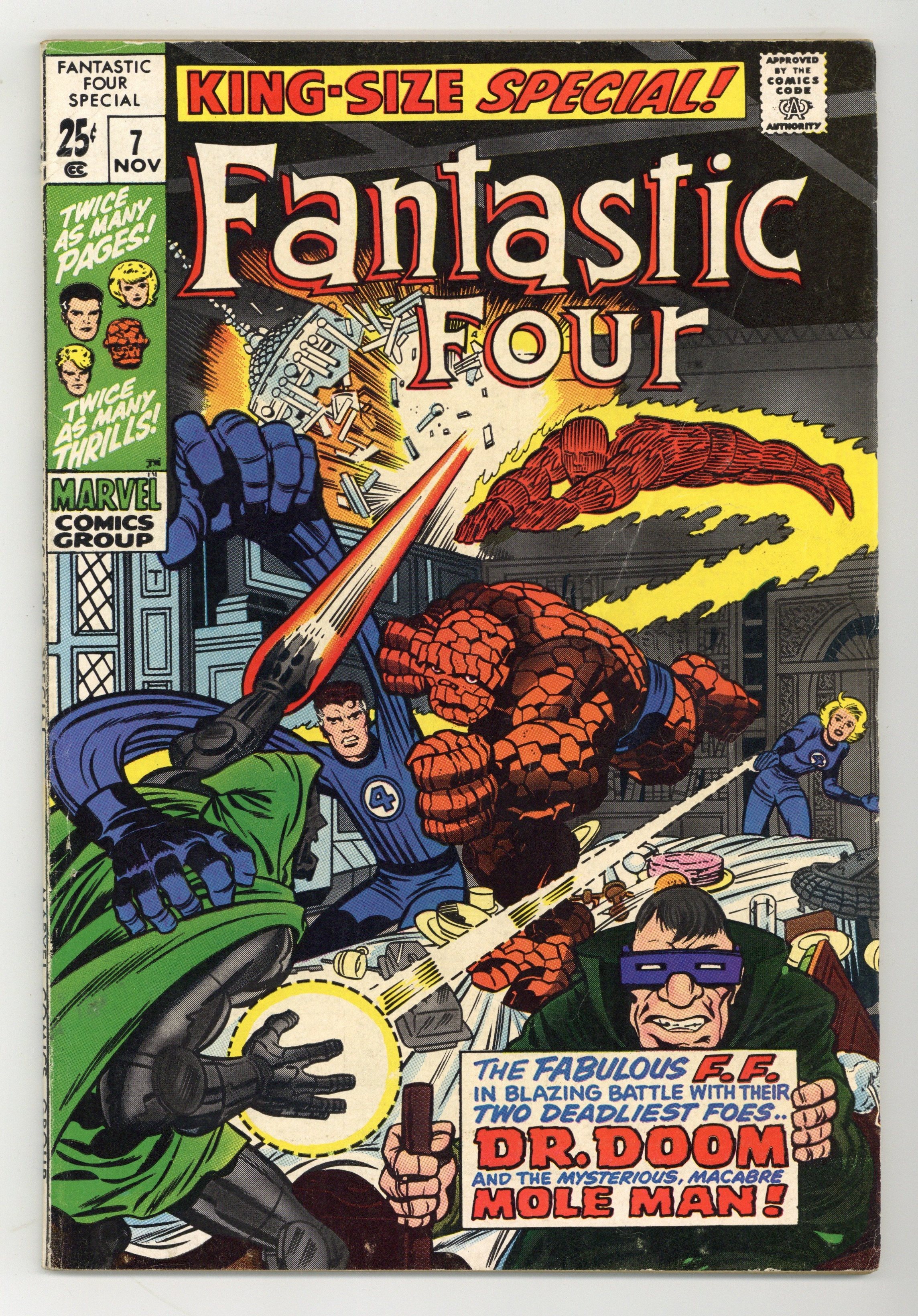 Ended Jul 28 2025 Bid History 5 bids Winning Bid $12 All Jack Kirby reprints: "The Fantastic Four Meet the Mole Man" (from FF 1), "Origin of Doctor Doom" and "The Final Victory of Dr. Doom" (FF Annual 2). This issue also contains four pages of black-and-white photos of 41 Marvel writers, artists, and staff members. New cover by Jack Kirby/Joe Sinnott. 68 pgs. Cover price $0.25. Grade: VG 4.0 explanation of grade Condition: Used (collectible)