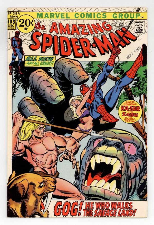 Ended Jul 28 2025 Bid History 13 bids Winning Bid $40 "Walk the Savage Land!" Part 1 of 2. Guest-starring Ka-Zar. Script by Roy Thomas. Pencils by Gil Kane. Inks by Frank Giacoia. Cover by Gil Kane and Frank Giacoia. Spider-Man and Gwen Stacy in the Savage Land with Ka-Zar!What a cover preview! But how did they get there? The story begins a few days earlier when J. Jonah Jameson -- upset about the Daily Bugle's declining circulation numbers -- hears a tale about a mysterious monster in the Savage Land. Jonah immediately orders an in-depth feature on Ka-Zar'shidden jungle to boost the Bugle's sales! And he will lead the expedition to Antarctica himself! However the Savage Land is fraught with danger. Shortly after the group arrives, the gigantic monster called Gog grabs Gwen!And the web-slinger will move heaven and earth...and anything else in the Savage Land...to get her back! Cameo appearances by Joe Robertson, Zabu, and Kraven the Hunter. First 20ยข cover price. (Notes: Ka-Zar and the web-slinger first met in Amazing Spider-Man #57. This issue was reprinted in Marvel Tales #81 and #82.) 36 pages. Cover price $0.20. Grade: FN 6.0 explanation of grade Condition: Used (collectible)