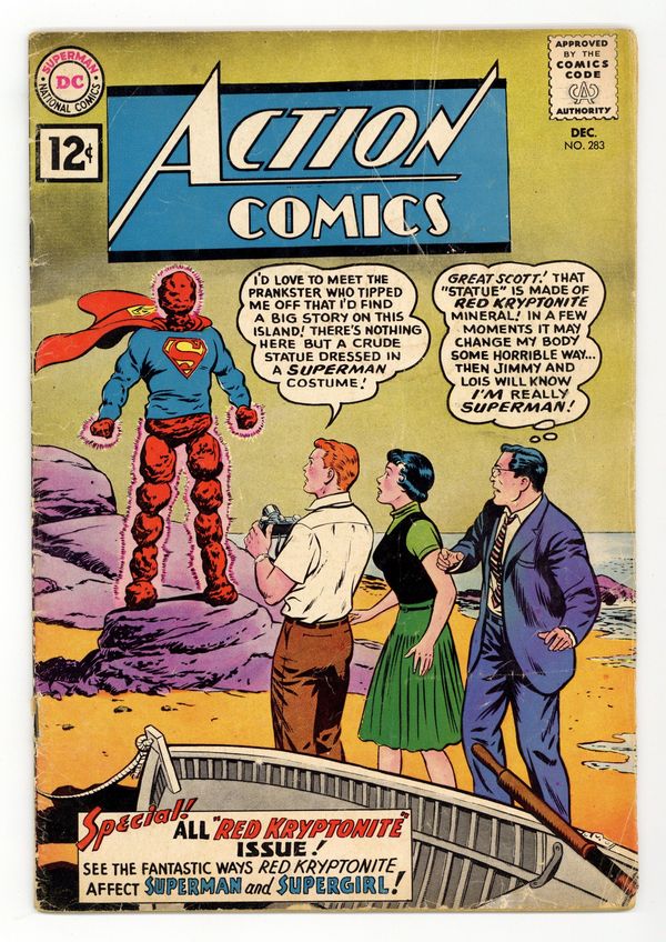 Ended Aug 4 2025 Bid History 7 bids Winning Bid $25 First 12-cent cover price. Cover pencils by Curt Swan, inks by Stan Kaye. Legion of Super-Villains appearance in "The Red Kryptonite Menace!", script by Robert Bernstein, pencils by Curt Swan, inks by Stan Kaye; Two shape-changing Durlans arrive on earth from the 30th century; They collect red and green kryptonite in an attempt to kill Superman; Three different Red Kryptonite meteors give Superman the ability to make his wishes come true, shoot fire from his mouth when he talks and read minds; Chameleon Men disguise themselves as President John F. Kennedy and Russian Premier Nikita Khrushchev. One-page Little Pete story by Henry Boltinoff. "The Six Red 'K' Perils of Supergirl!", script by Jerry Siegel, art by Jim Mooney; When Mr. Mxyzptlk made Supergirl invulnerable to Kryptonite, he neglected to extend the spell to cover Red Kryptonite as well. As a result, exposure to six Red K meteors turns Supergirl into a fat girl, a wolf-girl, and a microbe-sized girl. 36 Pages, Full Color. $.12 Cover price $0.12. Grade: GD 2.0 explanation of grade Condition: Used (collectible)