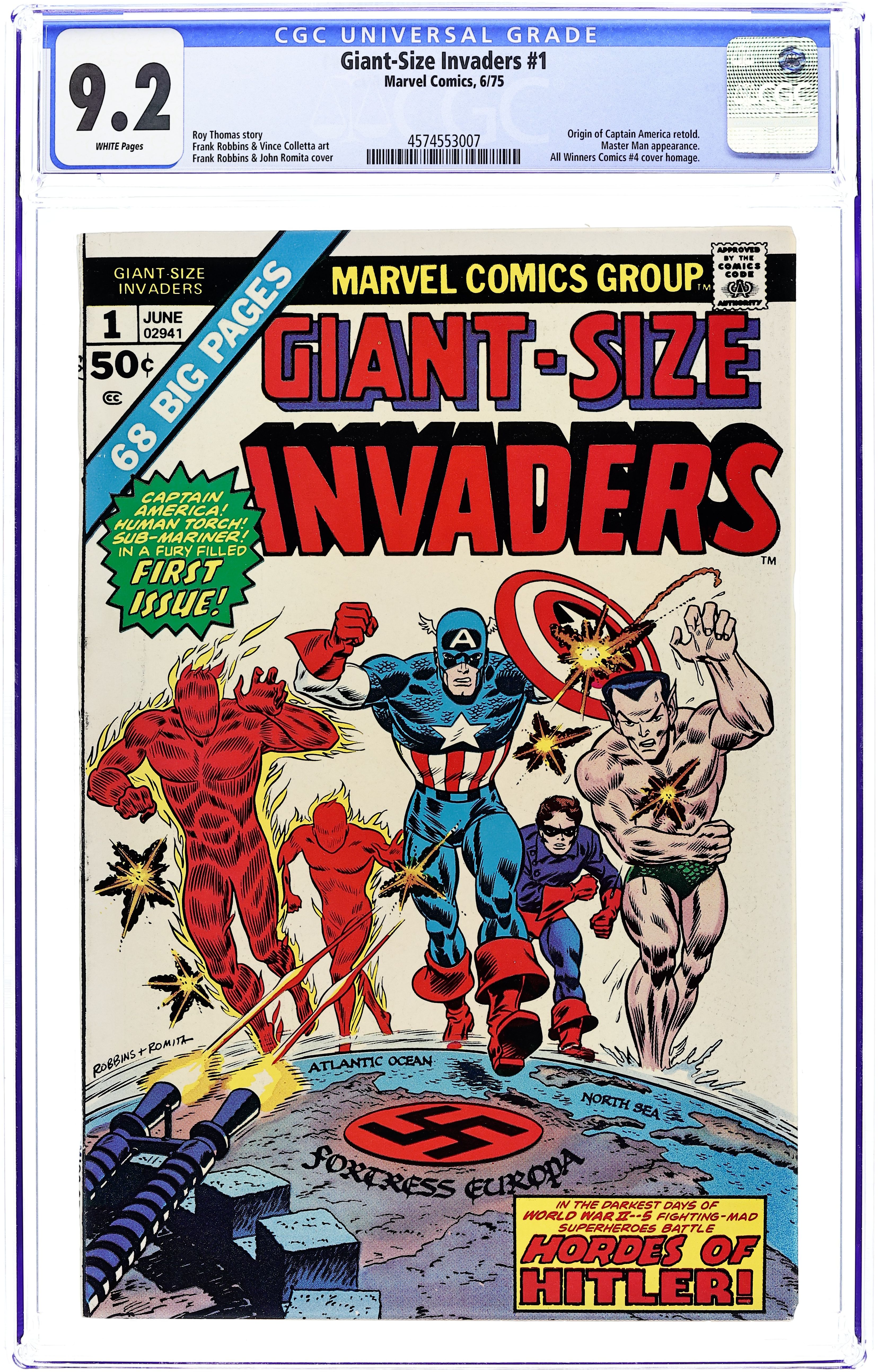 "The Coming of the Invaders!" Written by Roy Thomas. Art by Frank Robbins and Vince Colletta. Long before the Avengers, there were the Invaders. Captain America, the world's first super soldier, Prince Namor, the world's first mutant, and the Human Torch, the world's first android, and their sidekicks Bucky and Toro to form the Invaders. The greatest heroes of the Golden Age unite to win World War II and take down the Axis Powers once and for all. Their first mission: the Invaders race against the clock to save the Prime Minister of the United Kingdom, Winston Churchill, from an assassination plot. NOTE: 1st appearance of Master Man. 68 pages, FC. Cover price $0.50. Grade: CGC 9.2 explanation of grade Condition: Used (collectible)