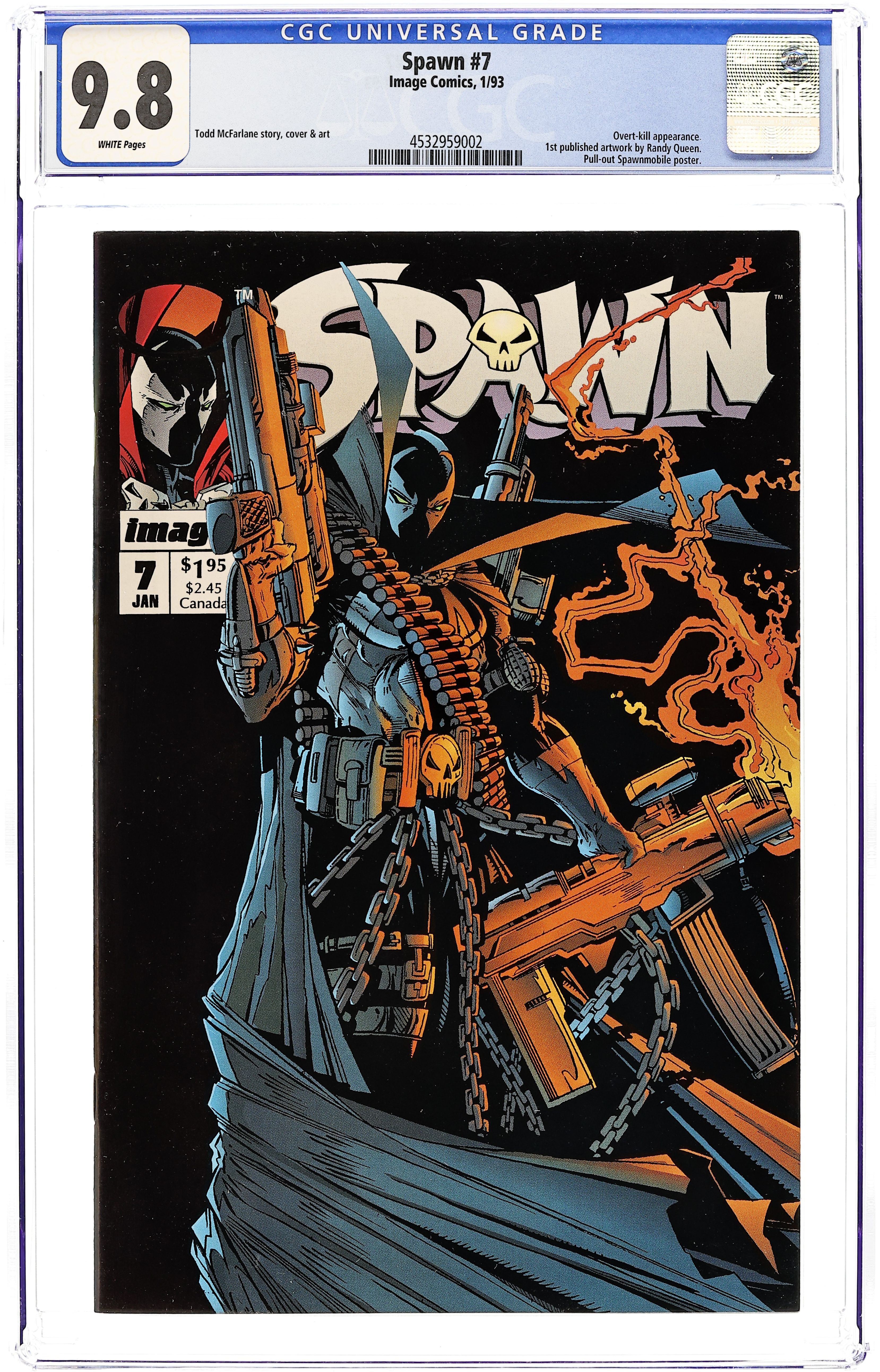 Direct edition. "Payback!" Part 2 of 2. Created, story, and art by Todd McFarlane. After barely surviving his encounter with the cybernetic juggernaut known as Overtkill, Spawn decides it's time to break out the heavy artillery. Using his special forces training and an arsenal of state of the art weaponry, Spawn proceeds to dismantle one of the most dangerous villains in the Image Universe. Thus cementing his role as a force to be reckoned with in the IU. Cover price $1.95. Grade: CGC 9.8 explanation of grade Condition: Used (collectible)