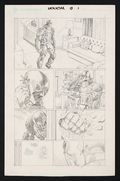 Caught in the crosshairs of Crime-Master, it's not just Venom who's in danger- it's Flash Thompson too! Though she's already broken up with Flash, Betty Brandt is still a target for Venom's enemies and we see him checking out her apartment to make sure she hasn't already been attacked. Tight, detailed pencils from Medina here that do a wonderful job of giving the symbiote suit life and texture. Pencil on comic art board. 11" x 17". NOTE: The first panel here was redrawn for publication, showing Venom having more obviously just leaped in through a window, rather than already walking through the apartment as seen here.