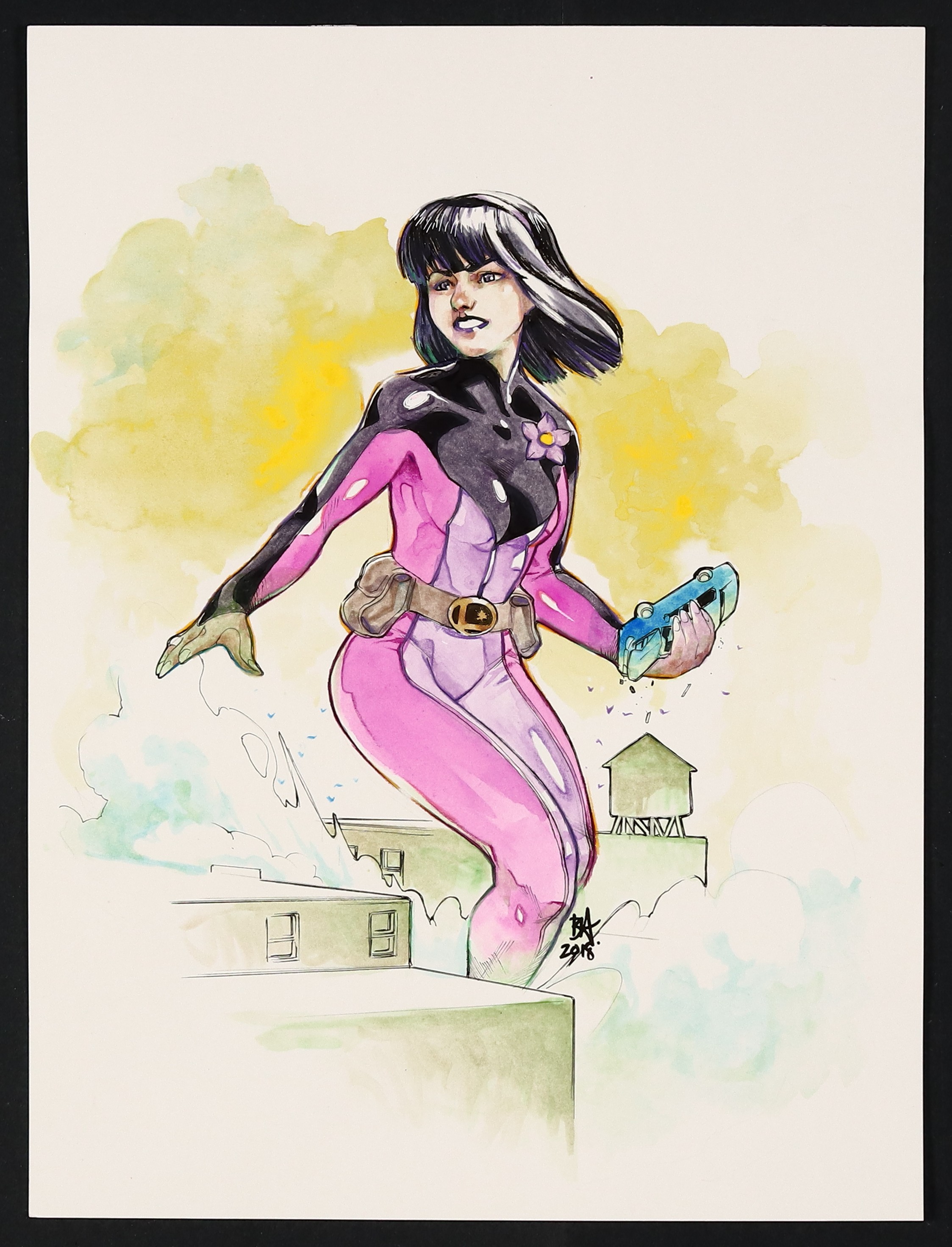 As her name suggests, Salu Digby was known for her shrinking ability- until the Emerald Eye gave her Leviathan's growth powers as she held his dying body. A beautiful piece from Harvey homaging the iconic poster for Attack of the 50-Foot Woman! Signed by the artist. Pencil, ink, and watercolor on art board. 10 1/2" x 14".