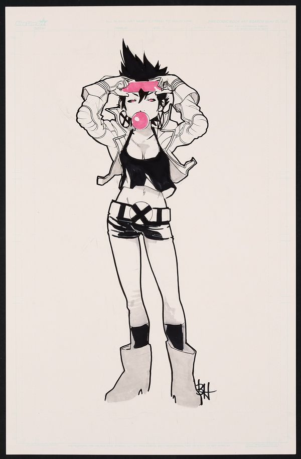 Jubilee Sketch by Ben HarveySOLD$180.00- Jubilee becoming a vampire was a bit of controversial story decision, but Ben Harvey makes the idea look great here thanks in part to an excellent use of spot color in the otherwise B&W piece. Signed by the artist. Pencil, ink, and alcohol marker on comic art board. 11" x 17".