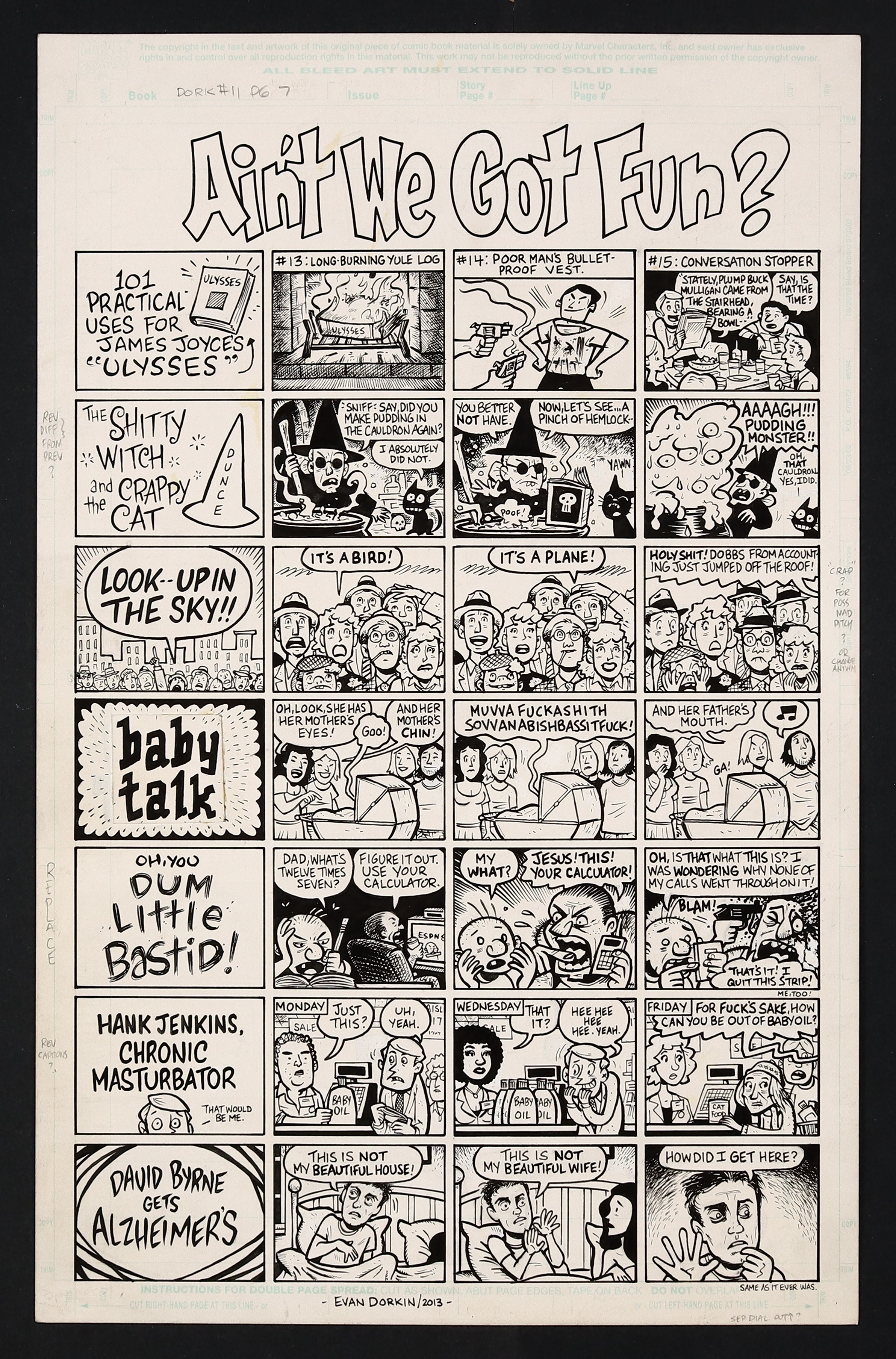A truly packed page from Dokin's fantastic anthology that features seven comic strips. Dorkin's expressive, detailed art shines here as does his trademark sense of humor which has made him one comics' preeminent humorists (and truthtellers!) Pencil and ink on Marvel Comics art board. 11" x 17 1/4".