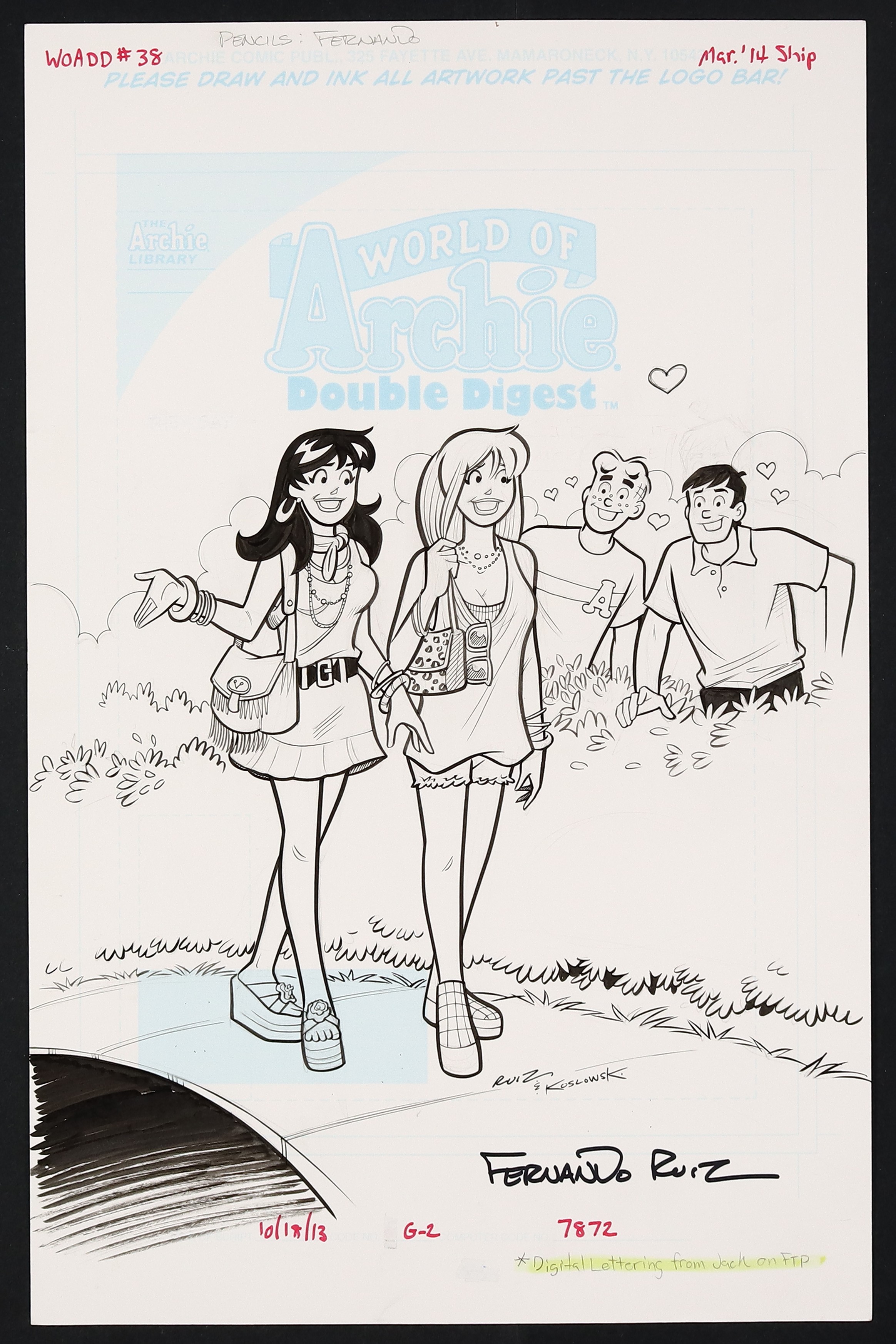 A classic Archie scenario for this cover- Betty and Veronica having a nice stroll while Archie and Reggie behave...totally normally. Yep, just normal guys hanging out in the bushes. Signed by the artists in the piece and by Ruiz in the lower margin. 11" x 17". Pencil and ink on Archie Comics art board with printed trade dress.