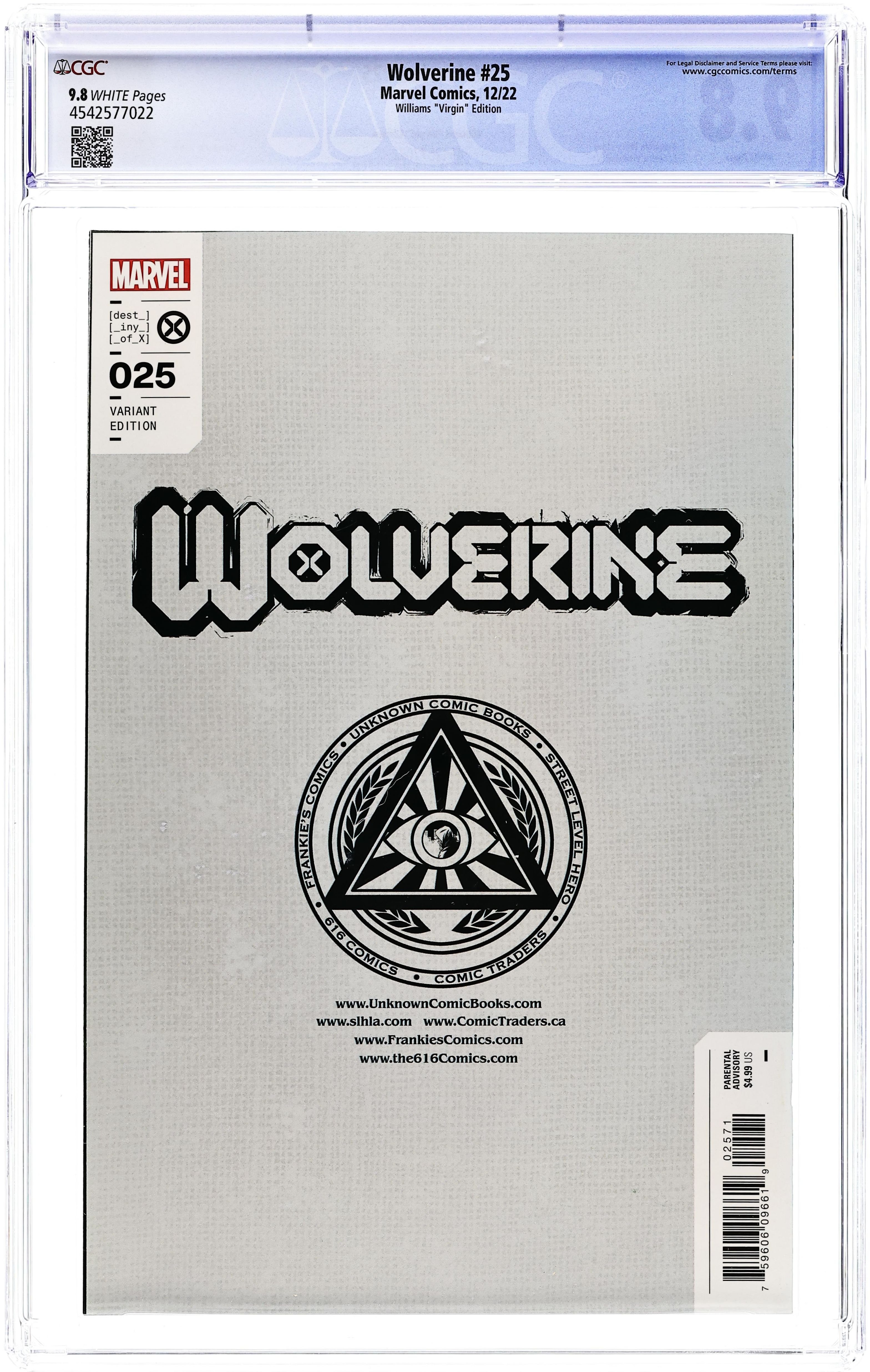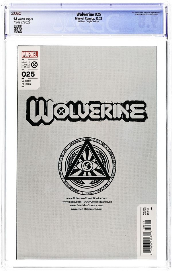 Ended Aug 4 2025 Bid History 10 bids Winning Bid $40 Comics Illuminati (Unknown Comics, Street Level Hero, Comic Traders, Frankies Comics, and The 616 Comics) Exclusive Virgin Cover by Scott Williams. Written by Benjamin Percy. Art by Adam Kubert; Andrea Di Vito; Marvel Various. CELEBRATING 25 ISSUES OF LOGAN'S LATEST RUN! - AN A.X.E. TIE-IN! A desperate race to the top of the world forces WOLVERINE to team-up with SOLEM! But will the HAND'S HELLBRIDE bring them to an untimely end, or will the CELESTIAL doom the unlikely team-up? PLUS: BAR BRAWL! A rough and tumble 25th issue celebratory story with an array of artists ready to unleash some adamantium-laced action! 36 pages, full color. Parental Advisory Grade: CGC 9.8 explanation of grade Condition: Used (collectible)