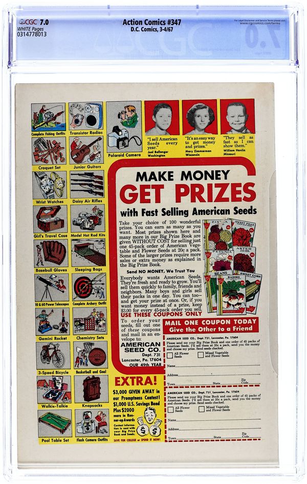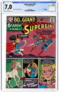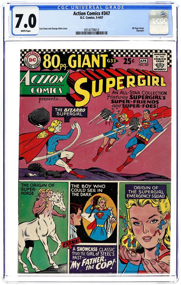 Ended Aug 4 2025 Bid History 9 bids Winning Bid $56 Giant Supergirl G-33; reprints origin of Comet; Bizarro appearance. Cover pencils by Curt Swan, inks by George Klein. "The Boy Who Could See in the Dark," script by Otto Binder, art by Jim Mooney; Supergirl rescues a boy with amnesia found lost at sea. He stays at the orphanage until Linda can figure out where he's really from; She learns that he is a prince from the planet Korvia who is fleeing prosecution for a crime he didn't commit. Supergirl's Legion Adventures article. "My Father, the Cop!", script by Jerry Siegel, art by Jim Mooney; Linda has to scheme to prevent herself from being adopted to protect her secret identity; she spends 30 days with the Wilkins. Mr. Wilkins is a policeman. "The Son of Bizarro!" (Part 1), script by Otto Binder, pencils by Wayne Boring, inks by Stan Kaye; Bizarro-Lois gives birth to Bizarro-Jr. No. 1 who, while he thinks like a Bizarro looks like Superman when he was Superbaby. "The Orphan Bizarro!" (Part 2). "The Bizarro Supergirl!" (Part 3). "Supergirl's Super-Boy Friends!", script by Jerry Siegel, art by Jim Mooney. "More About Supergirl's Super Friends" article. "The Secret Origin of Supergirl's Super-Horse!", script by Leo Dorfman, art by Jim Mooney. "The Many Eras of Supergirl" article. 84 Pages, Full Color. $0.25 Cover price $0.25. Grade: CGC 7.0 explanation of grade Condition: Used (collectible)