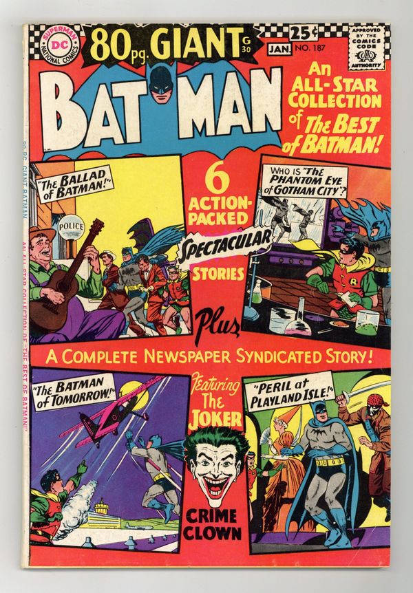 Reprints, 80-page giant. Cover pencils by Win Mortimer and Curt Swan, inks by Win Mortimer and Stan Kaye. "Batman's First Case" (from Detective # 265), script by Bill Finger, pencils by Sheldon Moldoff, inks by Charles Paris; The sudden appearance of a new criminal basing his crime on time jogs Batman's memory into remembering that this criminal was his very first case after his parents were killed, and if the Clock has his way, the current case against him will be the Caped Crusader's last! "Phantom Eye of Gotham City" (from Detective 192), pencils by Bob Kane, inks by Charles Paris; As vicious criminal creates a means to televise crimes as they happen and making the Dynamic Duo look like they are inept. "The Last Days of Batman" (from Batman 125), script by Bill Finger, pencils by Sheldon Moldoff, inks by Charles Paris; Carter Nichols sends the Dynamic Duo back to ancient Venice to gather evidence in a case, but only Batman returns, while Robin is shifted to Gotham City a few days into the future, where he discovers a new criminal will kill Batman. "Peril at Playland Isle" (from Detective 264), script by Bill Finger, pencils by Dick Sprang, inks by Charles Paris; When the wealthy builder of a new amusement park is killed, Batman and Robin nearly lose their lives tracking down the real killer. "The Batman of Tomorrow" (from Detective 216), script by Edmond Hamilton, pencils by Dick Sprang, inks by Charles Paris; When Bruce Wayne injures his arm, to keep Vicki from discovering that Batman has the same problem, the Caped Crusader seeks out the Batman of the Future to step in for him...almost with disastrous results! "The Ballad of Batman!" (from Batman 95), script by Edmond Hamilton, pencils by Dick Sprang, inks by Charles Paris; A balladeer comes to Gotham City to sing the praises of Batman in verse, but it backfires when his songs tip off crooks wanting to commit crimes. Cap's Hobby Hints activity half-page by Henry Boltinoff. A complete Batman newspaper syndicated story reprint featuring the Joker (7 pages) from Oct.-Dec. 1946. 84 Pages, Full Color. Cover price $0.25. Grade: FN- 5.5 explanation of grade Condition: Used (collectible)