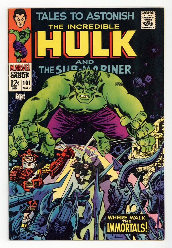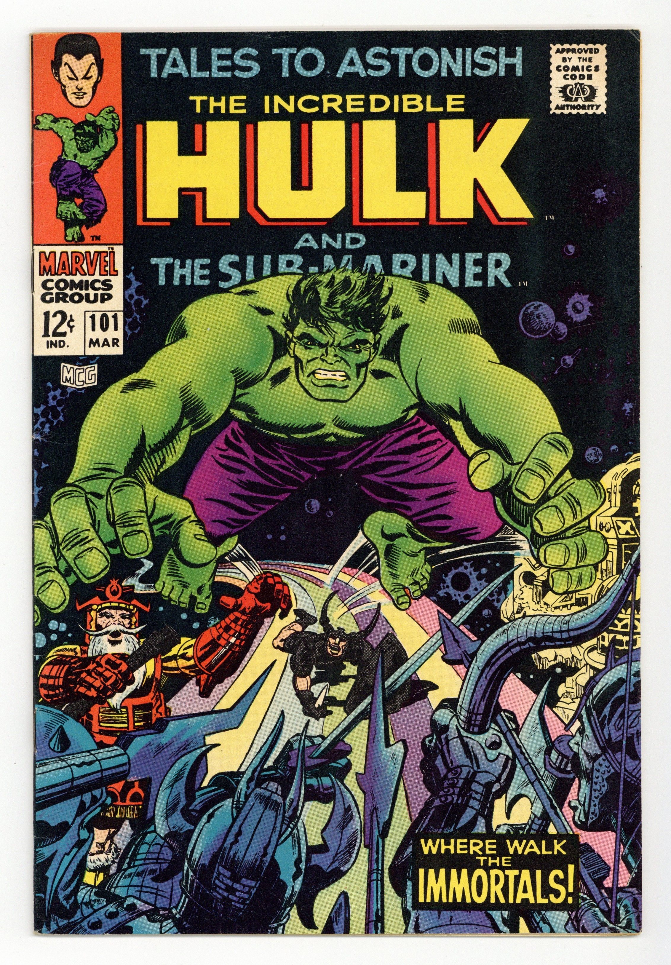 Cover by Marie Severin, Jack Kirby, Frank Giacoia, and Syd Shores. Where Walk the Immortals!, script by Stan Lee, art by Marie Severin and Frank Giacoia; Loki pulls the Hulk to Asgard to fight his father's forces; The Hulk battles the Warriors Three but in a moment of rare clarity, they discover that the jade giant is not really their enemy and refuse Loki's invitation to finish him off; Angered by his failure, Loki casts the Hulk into a bottomless pit. And Evil Shall Beckon, script by Archie Goodwin, art by Gene Colan and Dan Adkins; The Atlanteans abandon the second Atlantis; Namor goes to the Antarctic and finds Destiny hidden below the ice. 36 pgs., full color. The Hulk's solo adventures continue in the pages of Incredible Hulk (1962-1999 1st Series) #102. - Odinson, mycomicshop Archivist. Cover price $0.12. Grade: FN 6.0 explanation of grade Condition: Used (collectible)
