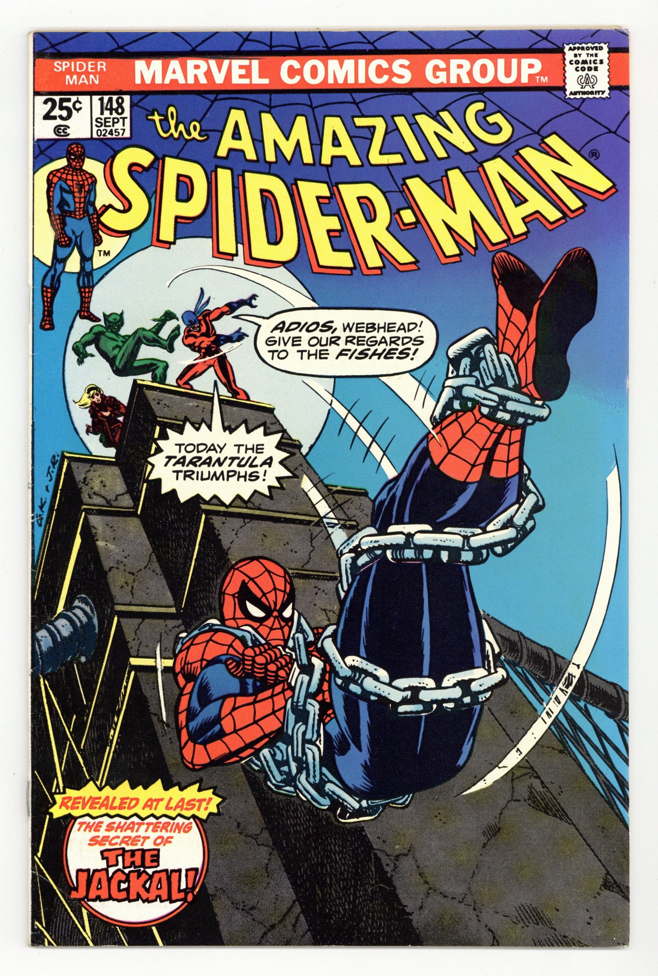 Ended Aug 4 2025 Bid History 16 bids Winning Bid $63 "Jackal, Jackal...Who's Got the Jackal?" Script by Gerry Conway. Pencils by Ross Andru. Inks by Mike Esposito and Dave Hunt (backgrounds). Cover by Gil Kane and John Romita Sr. As shown on the fateful cover, the Tarantula throws the shackled web-slinger off the top of the Brooklyn Bridge! Can the amazing one stop his freefall before slamming into the East River? If not, poor Spidey will sleep with the fishes and never learn the truth behind Gwen's return. Meanwhile at the Daily Bugle, Ned Leeds finally connects the dots about the Gwen Stacy clone! Apparently, Gwen once donated cell tissue samples in Professor Miles Warren's biology class at Empire State University! Hmmm, has the good professor been playing god in his spare time? All will be revealed next issue! Cameo appearance by Mary Jane Watson. Flashback cameos by Anthony Serba and Gwen Stacy. (Note: The letters page includes a letter from Eclipse comics publisher Dean Mullaney. This story was reprinted in Marvel Tales 125.) 36 pages. 25c cover price. Cover price $0.25. Grade: FN+ 6.5 explanation of grade Condition: Used (collectible)