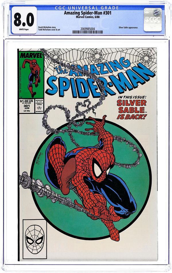 Ended Aug 11 2025 Bid History 12 bids Winning Bid $76 Direct Edition. "The Sable Gauntlet!" Guest-starring Silver Sable. Script by David Michelinie. Art by Todd McFarlane. Cover by Todd McFarlane. The first 300 issues of the Amazing Spider-Man are in the books after the web-slinger's epic battle vs. Venom last issue! And now the next chapter in the wall-crawler's anthology begins with an encounter with his favorite mercenary: Silver Sable! The enchanting sable agrees to make a test run through the security systems of a new high-rise office building, but deadly danger awaits on the top floor! Will Spidey catch the elevator in time? Cameo appearances by Mary Jane Watson and Dr. Morris Sloan. First $1.00 issue. (Notes: The cover is the same artwork (with different colors) as the cover to issue 300. This issue includes a full-page ad for the first appearance of Typhoid Mary in the Daredevil (1st) series -- art by John Romita Jr. and Al Williamson. The letters page contains a statement of ownership: average print run 469,913; average paid circulation 284,692. 36 pgs. Cover price $1.00. Grade: CGC 8.0 explanation of grade Condition: Used (collectible)