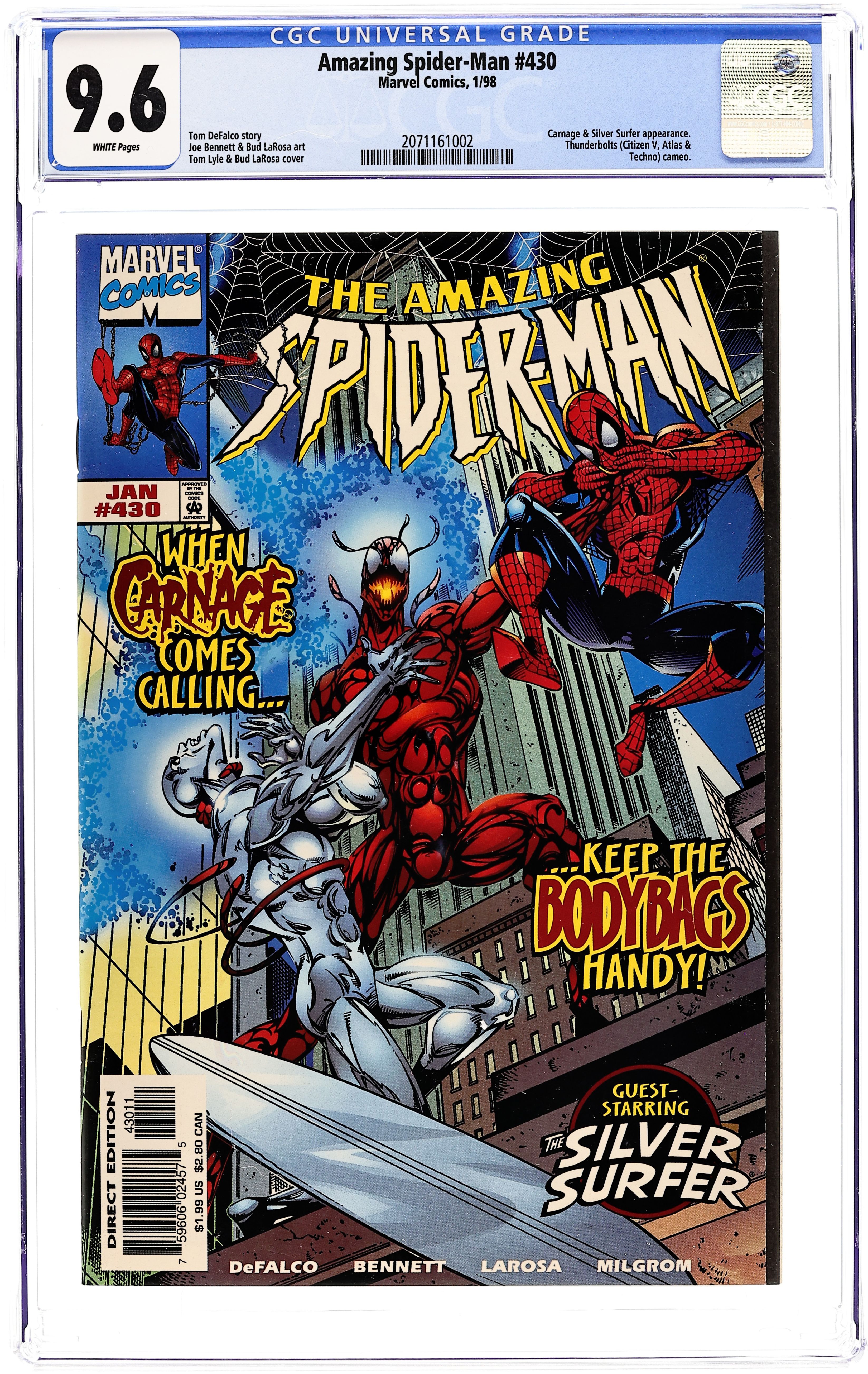 Ended Aug 4 2025 Bid History 8 bids Winning Bid $41 Direct Edition. Cover pencils by Tom Lyle, inks by Bud LaRosa. Carnage and the Silver Surfer guest star in "Savage Rebirth!", script by Tom DeFalco, pencils by Joe Bennett, inks by Bud LaRosa; Spider-Man rejoices that the Avengers have been confirmed to be alive; He begins dealing with the one million dollar reward the Bugle has on him; He heads toward the Baxter Building to visit the Fantastic Four, only to remember that the Thunder Bolts recently purchased the building; Peter agrees to quit being Spider-Man, as Mary meets up with Jill; Dr. Ashley Kafka, the new director of the Ravencroft Institute wants to shut down the microwave field holding back Cletus Kasady in order to cut costs. Cameos by Captain America, Iron Man, and the Vision. 38 pgs., full color. $1.99. Cover price $1.99. Grade: CGC 9.6 explanation of grade Condition: Used (collectible)