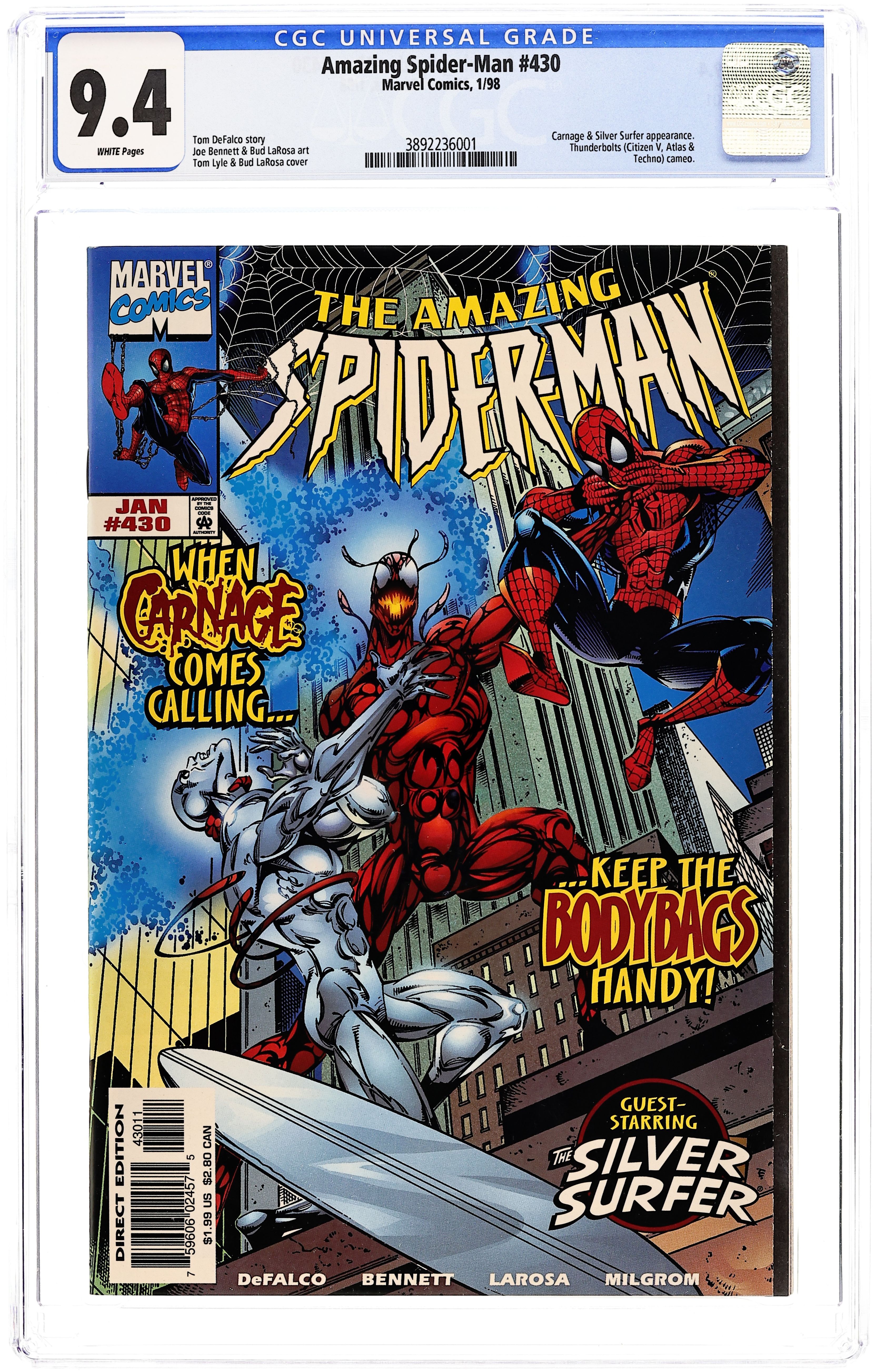 Ended Aug 4 2025 Bid History 15 bids Winning Bid $40 Direct Edition. Cover pencils by Tom Lyle, inks by Bud LaRosa. Carnage and the Silver Surfer guest star in "Savage Rebirth!", script by Tom DeFalco, pencils by Joe Bennett, inks by Bud LaRosa; Spider-Man rejoices that the Avengers have been confirmed to be alive; He begins dealing with the one million dollar reward the Bugle has on him; He heads toward the Baxter Building to visit the Fantastic Four, only to remember that the Thunder Bolts recently purchased the building; Peter agrees to quit being Spider-Man, as Mary meets up with Jill; Dr. Ashley Kafka, the new director of the Ravencroft Institute wants to shut down the microwave field holding back Cletus Kasady in order to cut costs. Cameos by Captain America, Iron Man, and the Vision. 38 pgs., full color. $1.99. Cover price $1.99. Grade: CGC 9.4 explanation of grade Condition: Used (collectible)