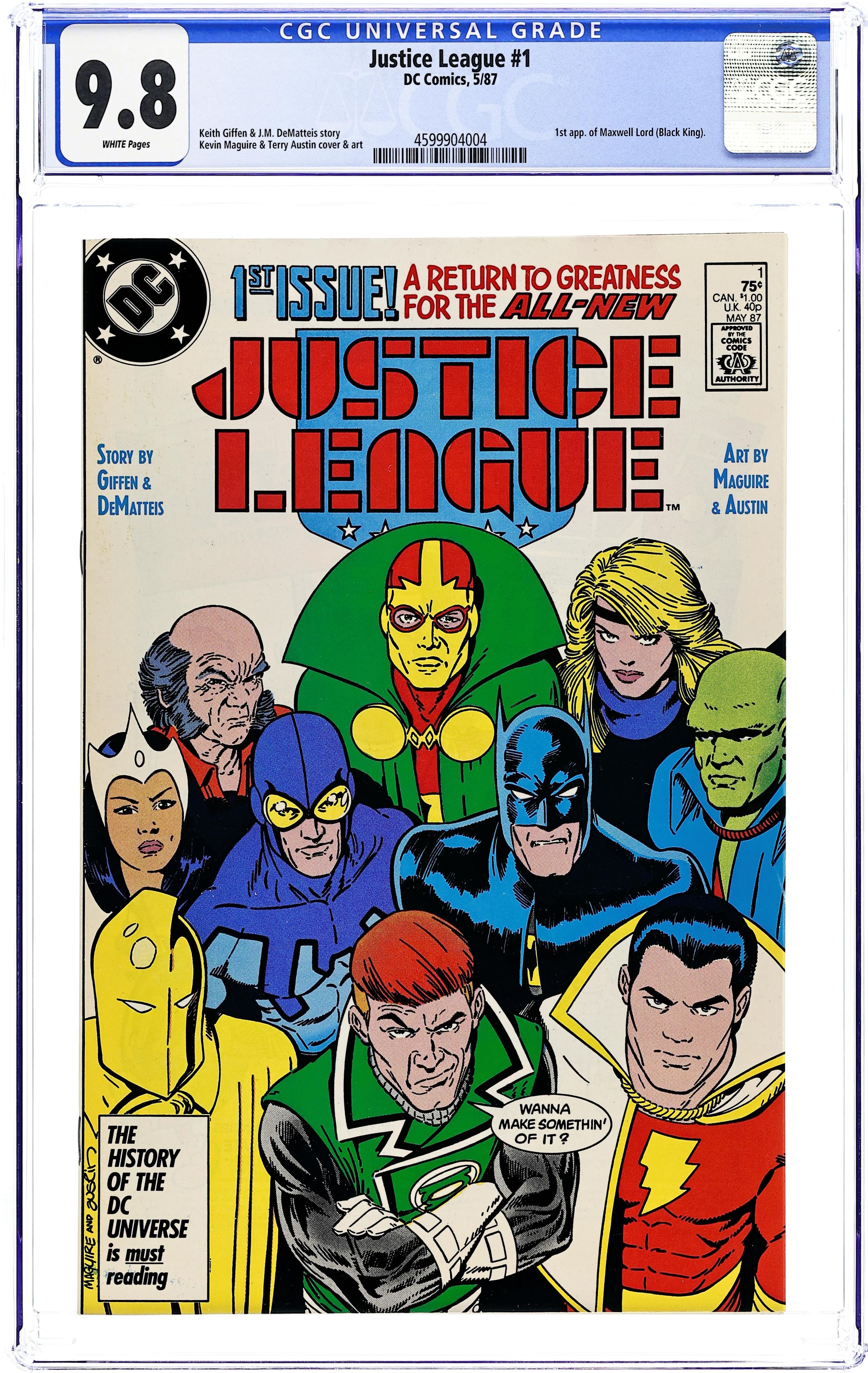 Ended Aug 4 2025 Bid History 20 bids Winning Bid $96 Direct Edition. When terrorists take the U.N. General Assembly hostage, Doctor Light (Kimiyo Hoshi) calls on the newly formed Justice League for help in "Born Again". Plot and breakdowns by Keith Giffen, script by Giffen and J.M. DeMatteis, pencils by Kevin Maguire, inks by Terry Austin. Batman, Guy Gardner, Black Canary, Mr. Miracle, Oberon, Captain Marvel, Martian Manhunter, Blue Beetle, Dr. Fate, Maxwell Lord. Maguire/Austin cover. Cover price $0.75. Grade: CGC 9.8 explanation of grade Condition: Used (collectible)