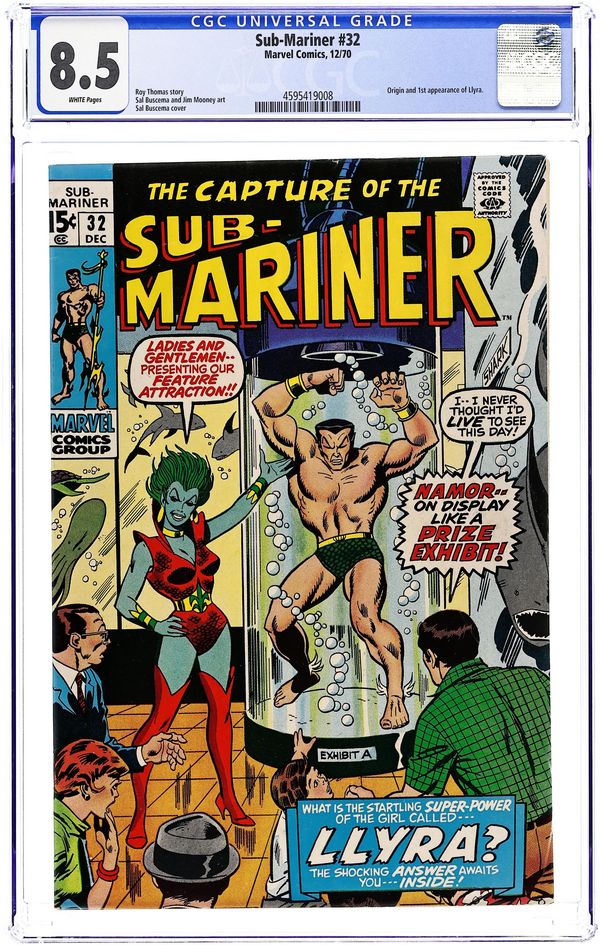 Cover art by Sal Buscema. "Call Her Llyra, Call Her Legend," script by Roy Thomas, pencils by Sal Buscema, inks by Jim Mooney; Seeking an undersea ally, Namor makes his way to the undersea realm of Lemuria; Namor meets Llyra, the empress of Lemuria, who has overthrown Karthon; She tells him of her origin in hopes of persuading him to join her conquest of the sea; Namor wants nothing to do with it and is caught off guard and captured; Namor meets Llyra's sister, Laurie, who frees him; Namor battles with the sea creatures Llyra can control and their battle ends in her death; However, Llyra changes back to Laurie and he realized that they both shared one body; Namor meets her mother and learns that it was her that had actually freed him. 36 pgs., full color. $0.15. Cover price $0.15. Grade: CGC 8.5 explanation of grade Condition: Used (collectible)