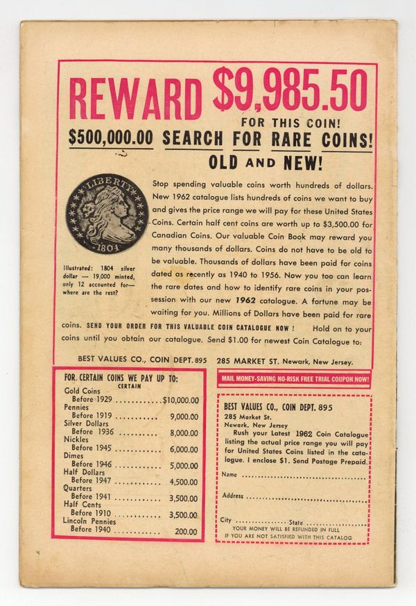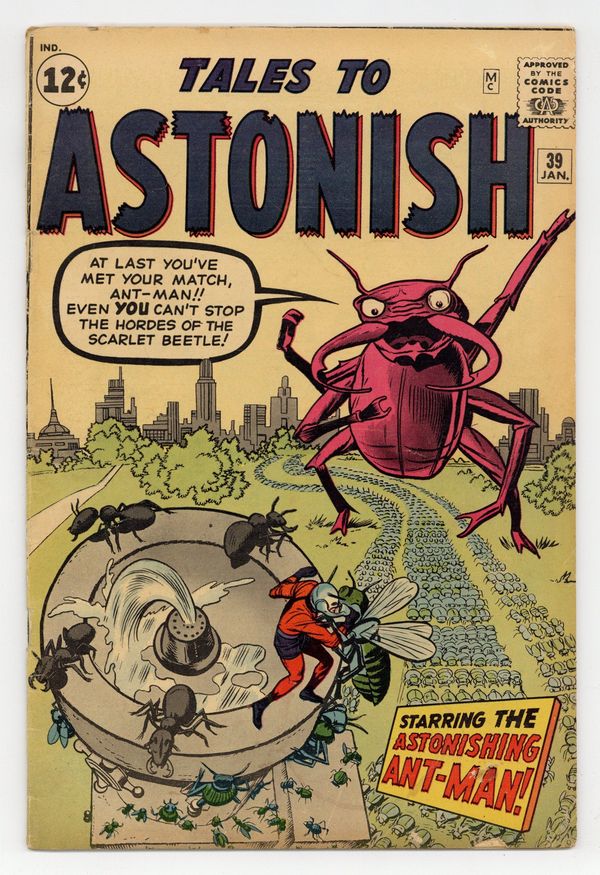 Cover by Jack Kirby and Dick Ayers. The Vengeance of the Scarlet Beetle!, script by Stan Lee and Larry Lieber, art by Jack Kirby and Dick Ayers; Ant-Man fights a beetle made super-intelligent by radiation. The Remedy Oil text story, art by Marie Severin. Ozamm the Terrible!, script by Stan Lee and Larry Lieber, art by Don Heck; A factory worker laid off to be replaced by a machine foils a seemingly invincible alien by cutting off his power source. The Toy Soldiers, script by Stan Lee, art by Steve Ditko; A boy who enjoys toy soldiers buys a new civil war figure to place in his prisoner of war stockade. 36 pgs., full color. $0.12. Cover price $0.12. Grade: GD/VG 3.0 explanation of grade Condition: Used (collectible)