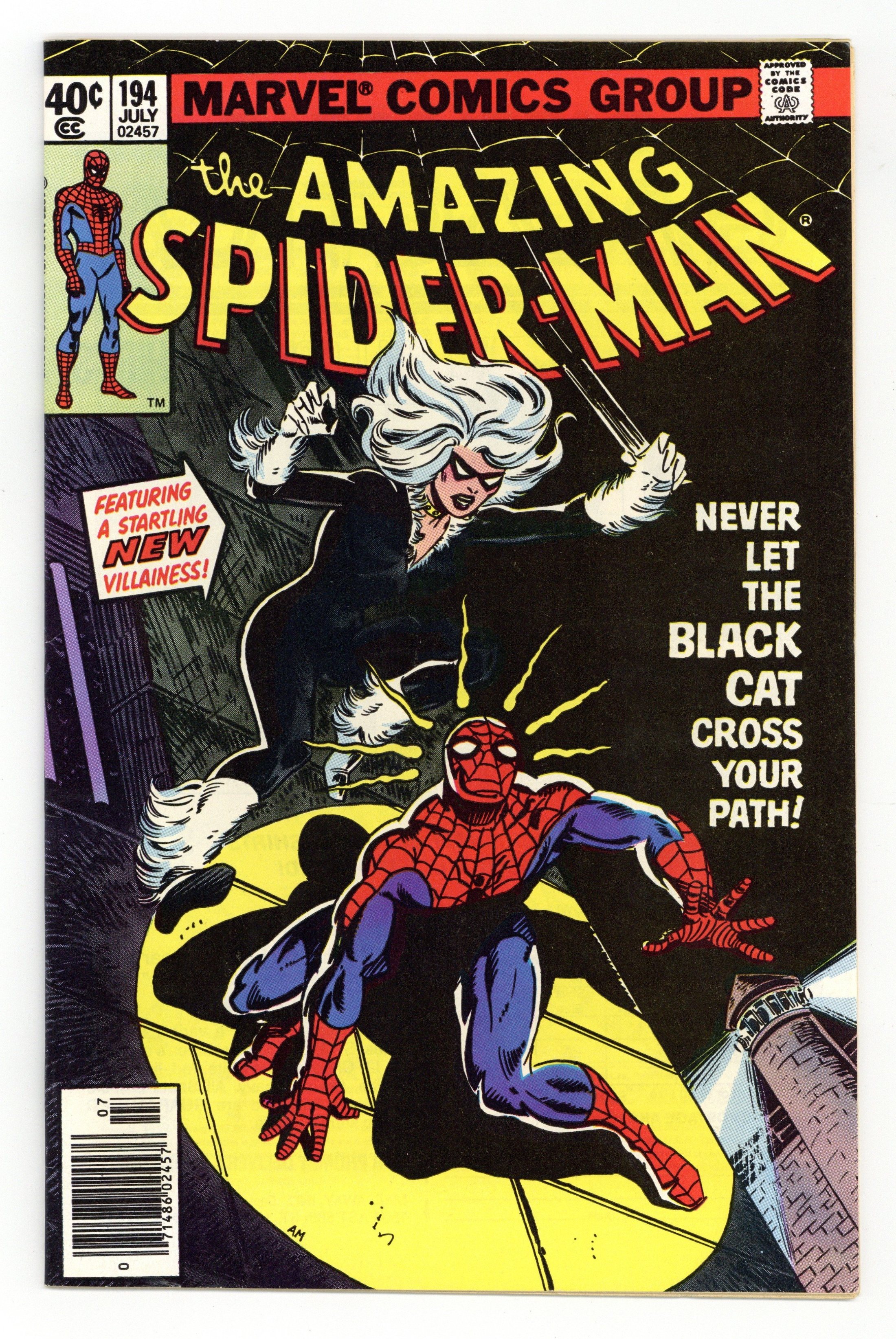 Newsstand Edition. First appearance of the Black Cat in "Never Let The Black Cat Cross Your Path!" Part 1 of 2. Script by Marv Wolfman. Art by Keith Pollard (breakdowns) and Frank Giacoia (finishes). Cover by Al Milgrom. One of the landmark issues of the Amazing Spider-Man series! The dazzling debut of the Black Cat! The wall-crawler has spent the first 193 issues of his title chasing super-villains! But tonight he's going to kiss one instead! Wow! Does the web-slinger stand a chance against the beauty and charm of Felicia Hardy? Not when the alluring cat has his tongue! And maybe later his heart! A terrific issue! Cameo appearances by Aunt May, Betty Brant, Ned Leeds, Harry Osborn, Flash Thompson, Mysterio (in civilian clothes), and the burglar. (Notes: The Black Cat is the creative highlight of the Wolfman-Pollard run on the Amazing Spider-Man title. Dave Cockrum designed the cat's costume. The letters page includes an alternate cover (for issue 194) by Keith Pollard. It also includes an alternate cover to Spider-Woman 9 by Carmine Infantino. This two-part story was reprinted in the trade paperback: Spider-Man vs. the Black Cat (2005). 36 pages, full color. Cover price $0.40. Grade: FN+ 6.5 explanation of grade Condition: Used (collectible)