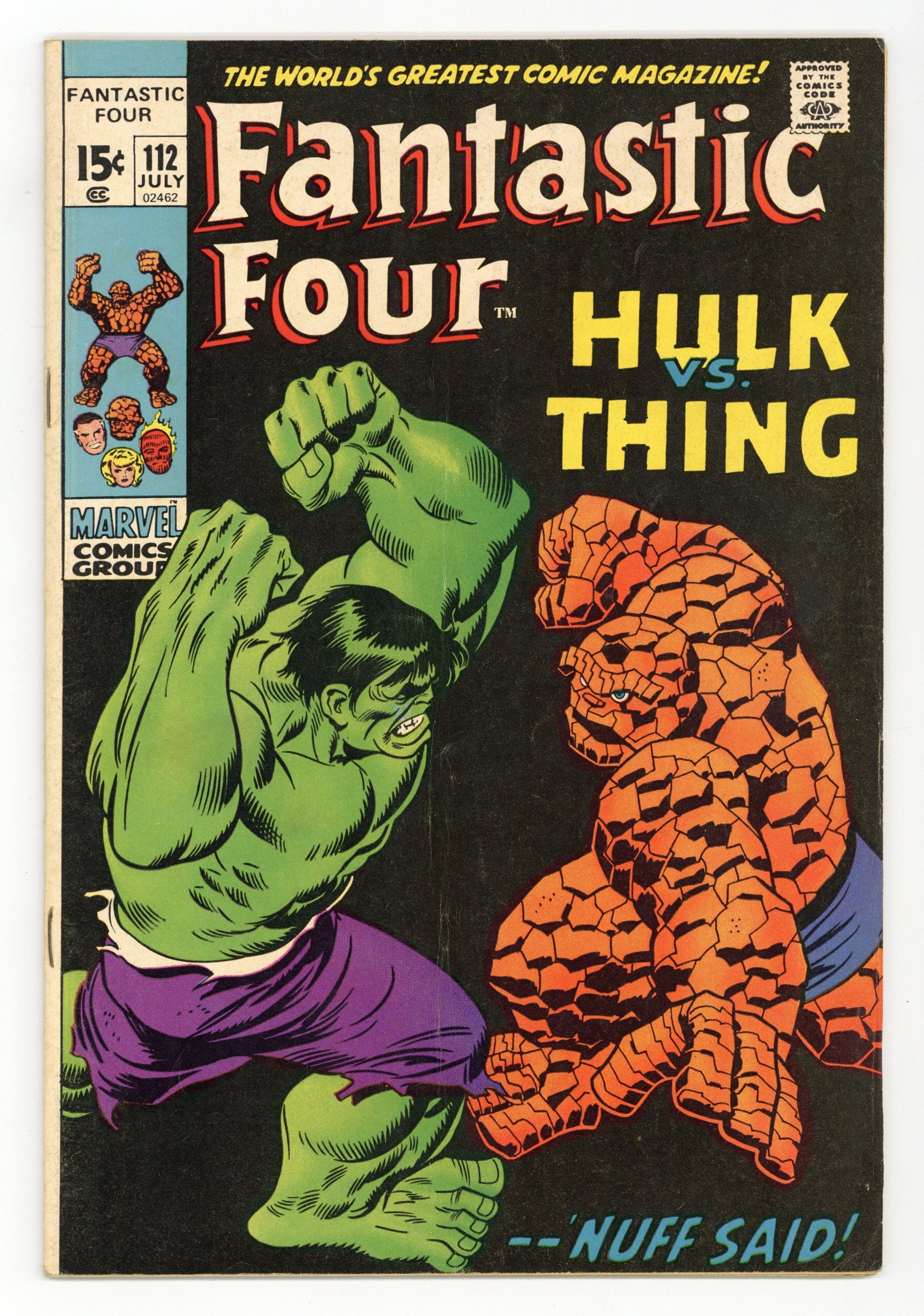 "Battle of the Behemoths!" Guest-starring the Hulk. Script by Stan Lee. Pencils by John Buscema. Inks by Joe Sinnott. Cover by John Buscema and Frank Giacoia. One of the landmark FF issues of the bronze age! And an outstanding cover too! The Thing has been a one-man wrecking crew in tearing up the city over the past several hours! And Mr. Fantastic, the Human Torch, and New York's finest are helpless to stop him! But now...enter the Hulk! Wow! The Green Goliath and the blue-eyed idol of millions battle from cover to cover until only one man is left standing! It's clobberin' time! Cameo appearances by Agatha Harkness, Alicia Masters, Franklin, and J. Jonah Jameson. (Notes: This issue was reprinted in Hulk vs. Thing 1 (1999). The Hulk and the Thing previously fought one another in Fantastic Four (1st series) 25 and 26. The powerful pair battle again in Marvel Feature (1st series) 11 and one more time in Giant-Size Super-Stars 1.) 36 pages, full color. Cover price $0.15. Grade: VG- 3.5 explanation of grade Condition: Used (collectible)