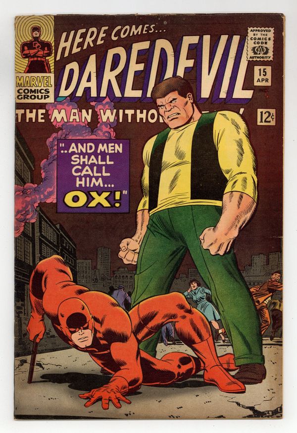 First appearance of the second Ox (Dr. Karl Stragg) in And Men Shall Call Him Ox!, script by Stan Lee, pencils by John Romita, inks by Frank Giacoia; The Ox is convinced by his cellmate, Dr. Karl Stragg, that if the two can escape, the good doctor will make Ox smarter; Stragg double-crosses the Ox and switches bodies with the brute; DD tracks down the new and improved Ox only to defeat him permanently. 36 pgs. Cover price $0.12. Cover price $0.12. Grade: GD 2.0 explanation of grade Condition: Used (collectible)