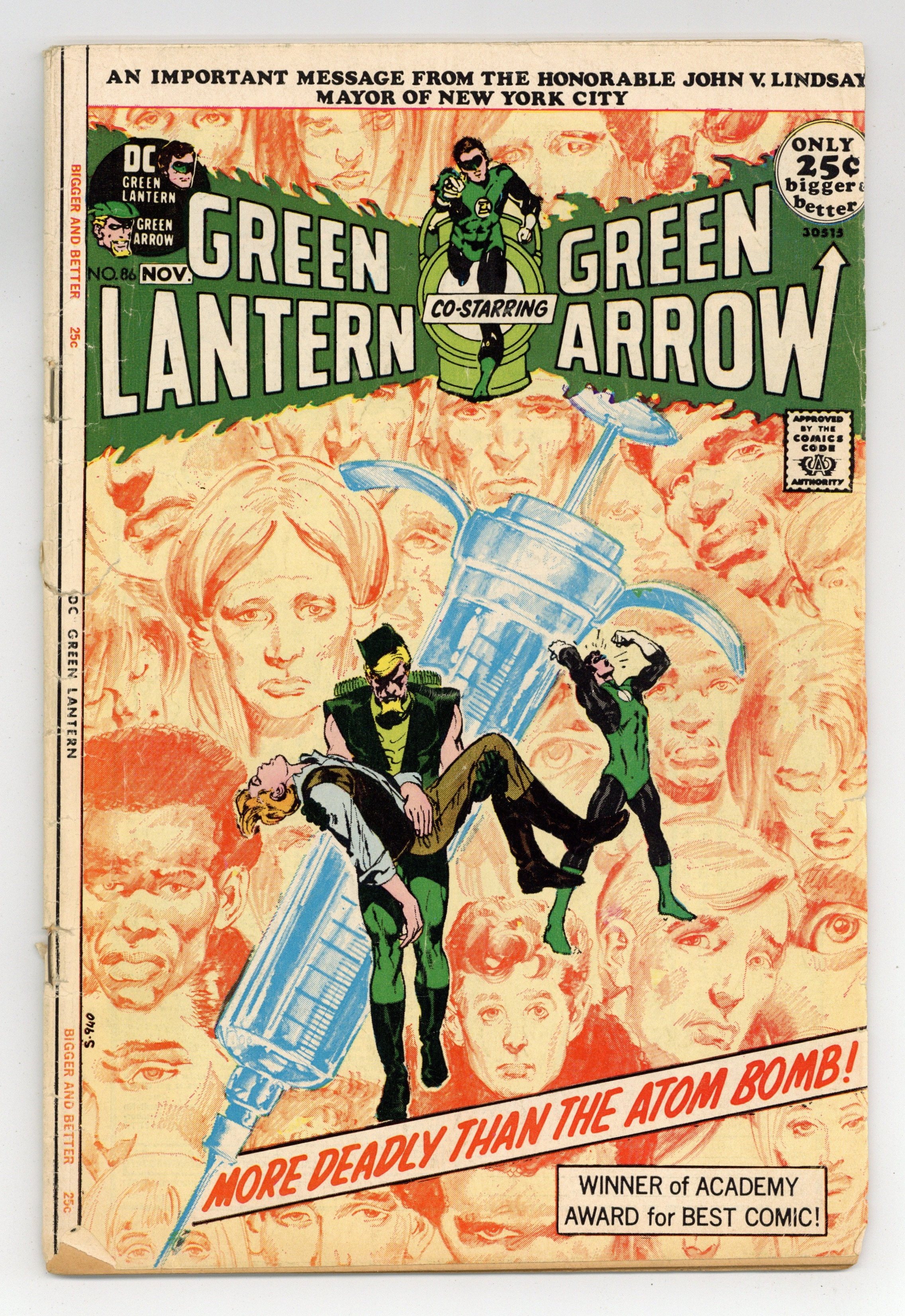 Ended Aug 25 2025 Winning Bid $34 Giant-size issue. Cover by Neal Adams. Green Arrow co-stars in this famous anti-drug issue. They Say It'll Kill Me... But They Won't Say When!, script by Denny O'Neil, pencils by Neal Adams, inks by Dick Giordano; Having discovered that Roy is a junkie, Green Arrow sets out to bring the drug traffickers down; Green Lantern returns to Oliver's building and finds Roy curled up in the basement; He takes Roy to Dinah's to straighten out and heads out to find Green Arrow, who has been knocked out by the drug dealers and tossed into the harbor to drown; GA escapes just as GL arrives to take out the goons who threw him into the water; Together the two trace the drugs to pharmaceutical magnate Salomon Hooper and put him out of business; But Roy explains that drugs are not the root problem, just a symptom of it. Anti-drug message from John V. Lindsay, mayor of New York City (1966-1973), thanking DC Comics for publishing the Green Lantern story in this and the previous issue. Reprint story: The Icicle Goes South! (from All-American Comics 92, December 1947), script by Robert Kanigher, art by Alex Toth; Green Lantern must stop the Icicle, who is helping a dictator to take over the South American country of Perumbia. 52 pgs., full color. $0.25. Cover price $0.25. Grade: GD+ 2.5 explanation of grade Condition: Used (collectible)