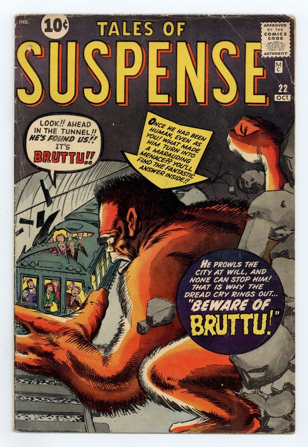 Cover pencils by Jack Kirby, inks by Steve Ditko. "Beware of... Bruttu," pencils by Jack Kirby, inks by Dick Ayers; An often bullied scientist accidentally transforms himself into a monster, and is attacked when he cant make himself understood; In his new form he discovers that the girl hed thought out of his league really loves him, and manages to make himself human again. "Mystery Trip" text story, art by Joe Maneely. "Only One Is Human!", art by Don Heck; A human unit on Mars realises that a disguised Martian is in their midst, they cannot tell the imposter and the real human apart, until a false piece of bad news makes the real human weep, uncovering the Martian. "The Anatomy of a Nightmare!", script by Stan Lee, art by Steve Ditko; A science fiction writer is stuck, so he takes some pills, hoping a nightmare will inspire him; He dreams of horrible red-eyed aliens, but is disappointed, since that's only his own dull world. 36 pgs., full color. $0.10. Cover price $0.10. Grade: GD/VG 3.0 explanation of grade Condition: Used (collectible)