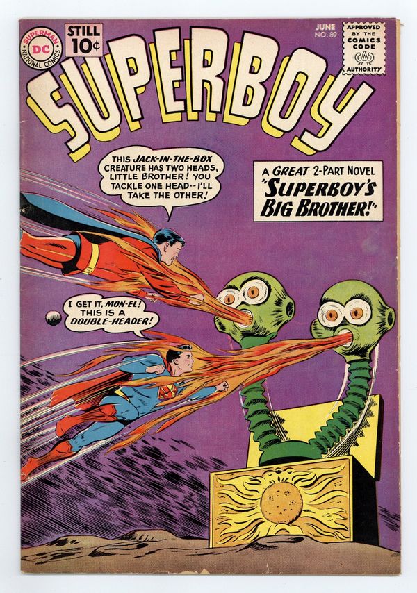 Ended Aug 4 2025 Bid History 15 bids Winning Bid $68 1st appearance of Mon-El. Cover pencils by Curt Swan, inks by Stan Kaye. Superboy's Big Brother!, script by Robert Bernstein, art by George Papp; When a spaceship crashes outside Smallville, Superboy finds an amnesiac, super-powered youth who might be his older brother. The Secret of Mon-El! [Superboy's Big Brother!], script by Robert Bernstein, art by George Papp; Trying to prove Mon-El isn't actually Kryptonian, Superboy accidentally exposes him to lead. Ollie humor page by Henry Boltinoff. The Super-Cop of Smallville!, script by Jerry Siegel, pencils by Curt Swan. 36 Pages, Full Color. Cover price $0.10. Grade: VG- 3.5 explanation of grade Condition: Used (collectible)