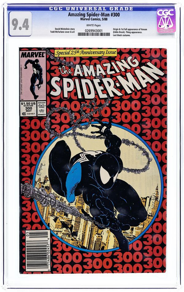Ended Aug 11 2025 Bid History 25 bids Winning Bid $715 Newsstand Edition. Giant-sized 25th anniversary issue. First full appearance of Venom in "Venom!", script by David Michelinie, art by Todd McFarlane; Spidey's old alien costume has merged with reporter Eddie Brock who thinks his career was ruined by Spider-Man and the symbiote of the two, Venom, takes on the web slinger; At MJ's request, Spidey returns to the blue and red costume as she now finds his black duds way too creepy; This is the last issue in which Spider-Man appears in his black costume; Thing (of the Fantastic Four) cameo.. Stan's Soapbox Special in place of letters page: Full page editorial by Stan on the occasion of Spider-Man's 300th issue. 52 pgs., full color. Cover price $1.50. Grade: CGC 9.4 explanation of grade Condition: Used (collectible)
