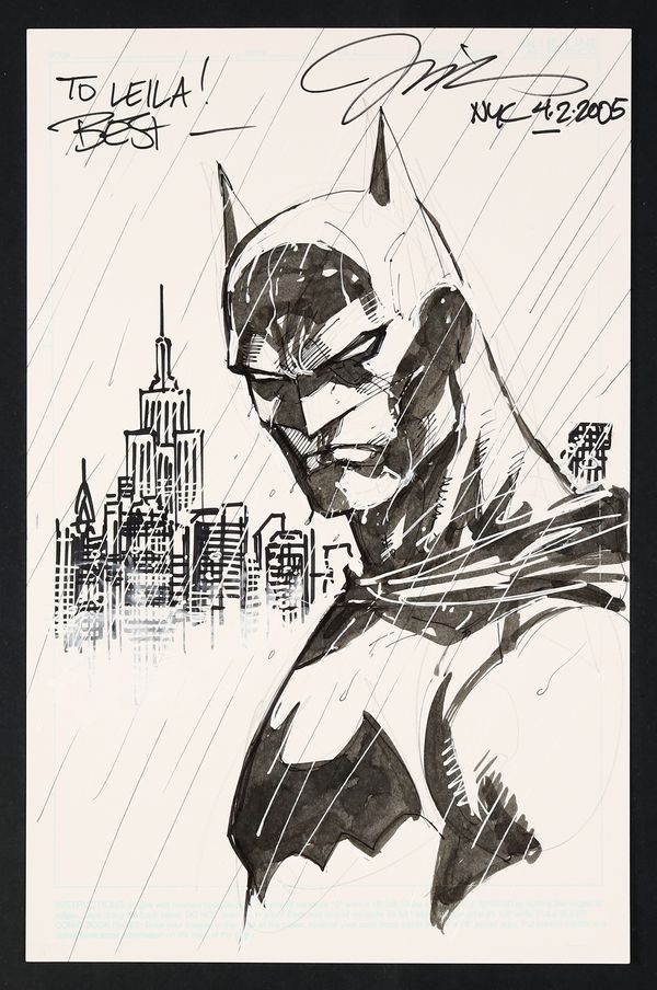 Lee's rendition of the Dark Knight has become the default look of Batman in the modern age and it's easy to why in this beautiful piece. Lee's use of mixed media gives the piece a wonderful sense of texture and energy, perfect for large format. Signed by the artist (personalized) and dated 4-2-2005. Pencil, ink, ink wash, and correction fluid on comic art board. 11" x 17".