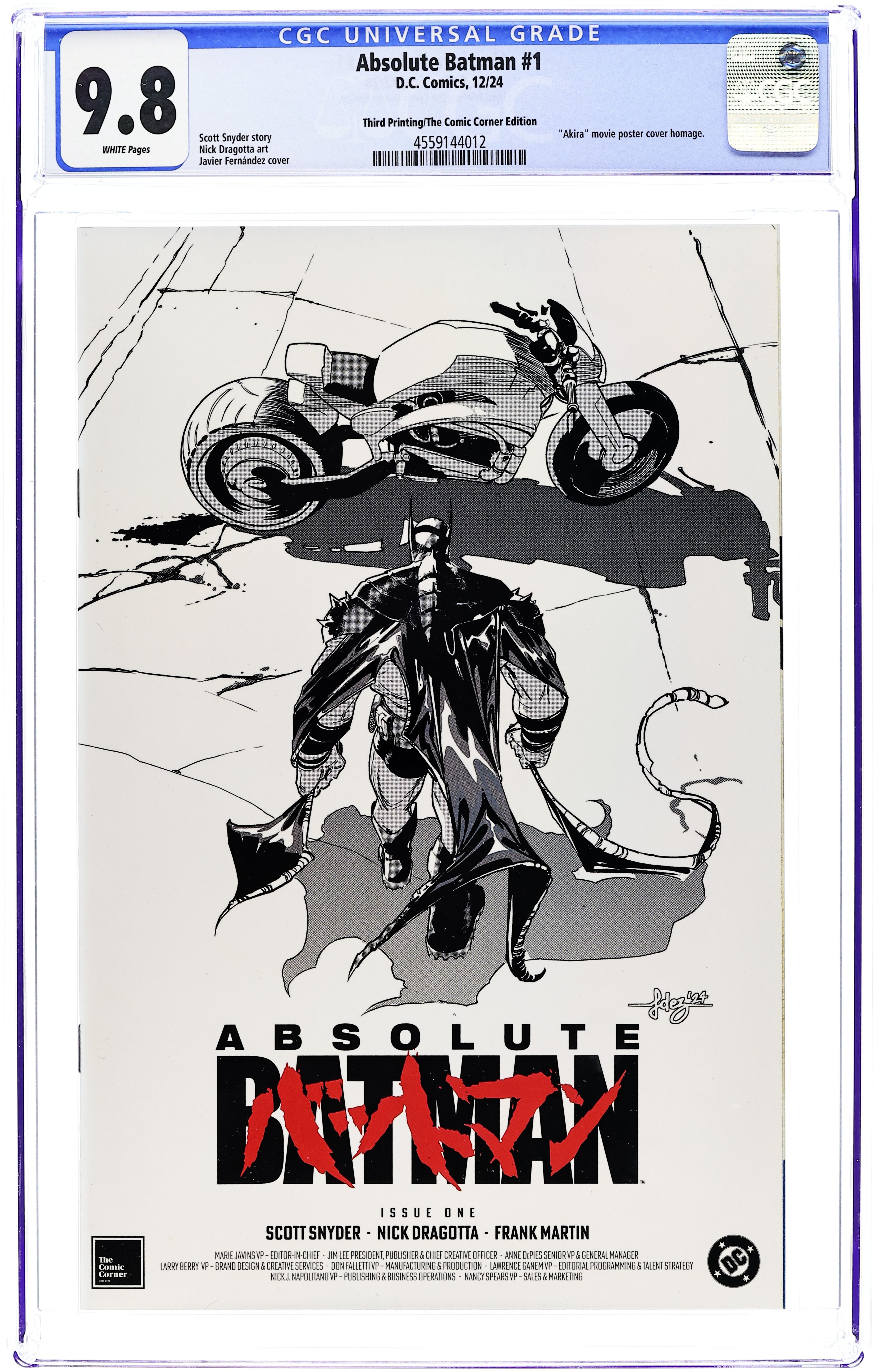 Ended Aug 18 2025 Bid History 18 bids Winning Bid $137 Third Printing. The Comic Corner Exclusive B&W Variant Cover by Javier Fernandez. Written by Scott Snyder. Art by Nick Dragotta. BATMAN LEGEND SCOTT SNYDER AND ICONIC ARTIST NICK DRAGOTTA TRANSFORM THE DARK KNIGHT'S TALE FOR THE MODERN AGE! Without the mansion...without the money...without the butler...what's left is the Absolute Dark Knight! 48 pages, full color. Rated T+ Grade: CGC 9.8 explanation of grade Condition: Used (collectible) unless item is a new release