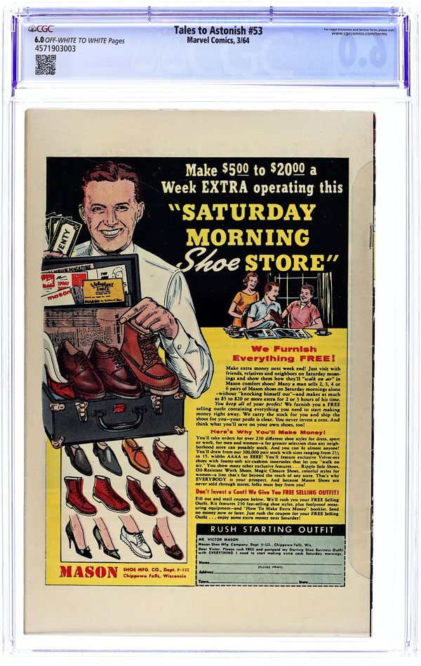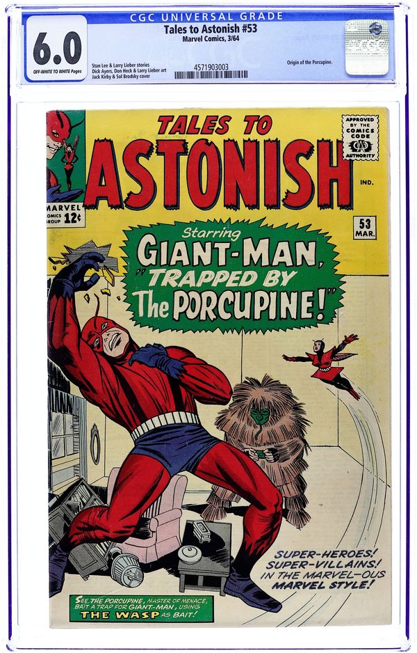 Cover by Jack Kirby and Sol Brodsky. Trapped by the Porcupine!, script by Stan Lee, art by Dick Ayers; The Porcupine uses Giant-Man's fan club to attack him and then he captures the Wasp. The Clock text story. When Wakes the Colossus!, script by Stan Lee and Larry Lieber, art by Larry Lieber and Don Heck; An alien warlord builds a giant statue to intimidate the superstitious, but it comes to life and takes the side of the rebels against him. 36 pgs., full color. $0.12. Cover price $0.12. Grade: CGC 6.0 explanation of grade Condition: Used (collectible)