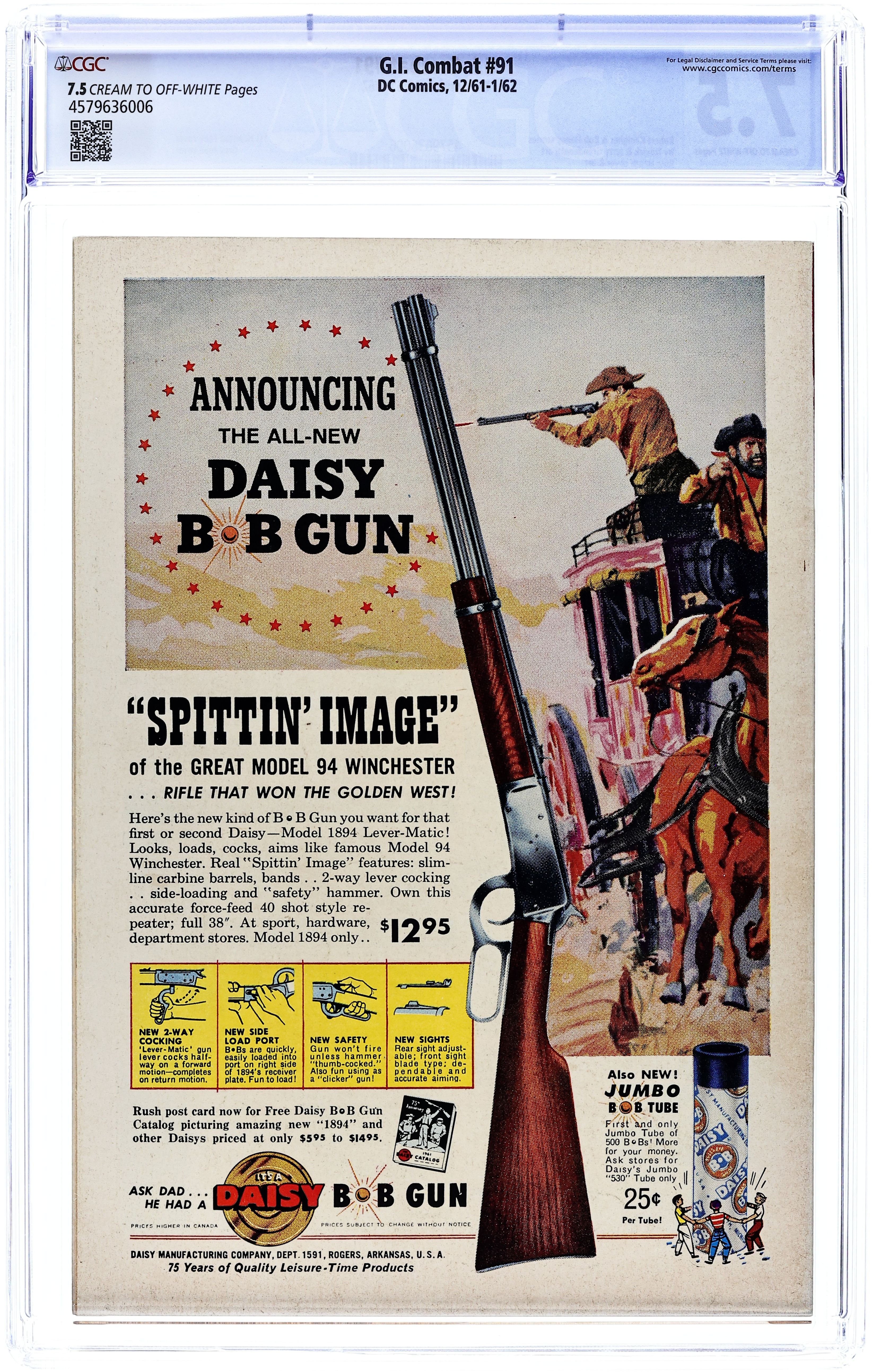 First 12c cover-priced issue. Cover by Russ Heath and Jack Adler (washtone). Written by Robert Kanigher and Bob Haney. Art by Russ Heath, Irv Novick and Jerry Grandenetti. The Haunted Tank crew helps a turtle and are in return helped by the turtle in "The Tank and the Turtle!" by Robert Kanigher and Russ Heath. Starring the Haunted Tank, Jeb Stuart, Arch Asher, Rick Rawlins, Slim Stryker and General J.E.B. Stuart (ghost). Plus: "Wings for a Wash-Out!" by Bob Haney and Irv Novick; "Secret War for a Snowbird!" by Haney and Jerry Grandenetti; and 1-pager "Marine Air Squadrons." 36 Pages, Full Color. Cover price $0.12. Grade: CGC 7.5 explanation of grade Condition: Used (collectible)
