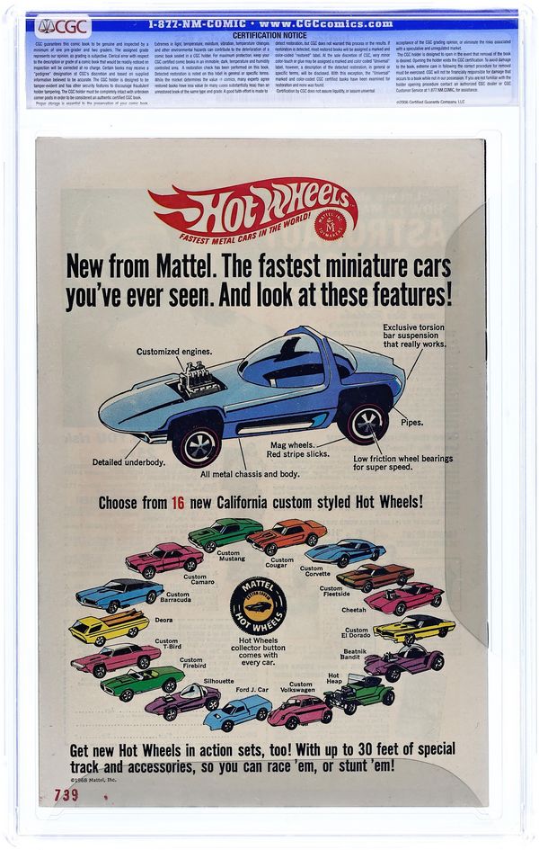 Cover pencils by Dick Dillin, inks by Joe Giella. T. O. Morrow Kills the Justice League -- Today!, script by Gardner Fox, pencils by Dick Dillin, inks by Sid Greene; T. O. Morrow has defeated the JSA on Earth-2 as part of his overall plan; Now he tries to defeat the Justice League in order to stop his latest scheme, which involves his supercomputer stopping all of time itself, which would be fatal to all, since Morrow didn't want that to happen; The revived JLA and JSA teams then defeat Morrow's supercomputer's plot,and Morrow is later jailed. 36 pgs. $0.12. Cover price $0.12. Grade: CGC 9.4 explanation of grade Condition: Used (collectible)