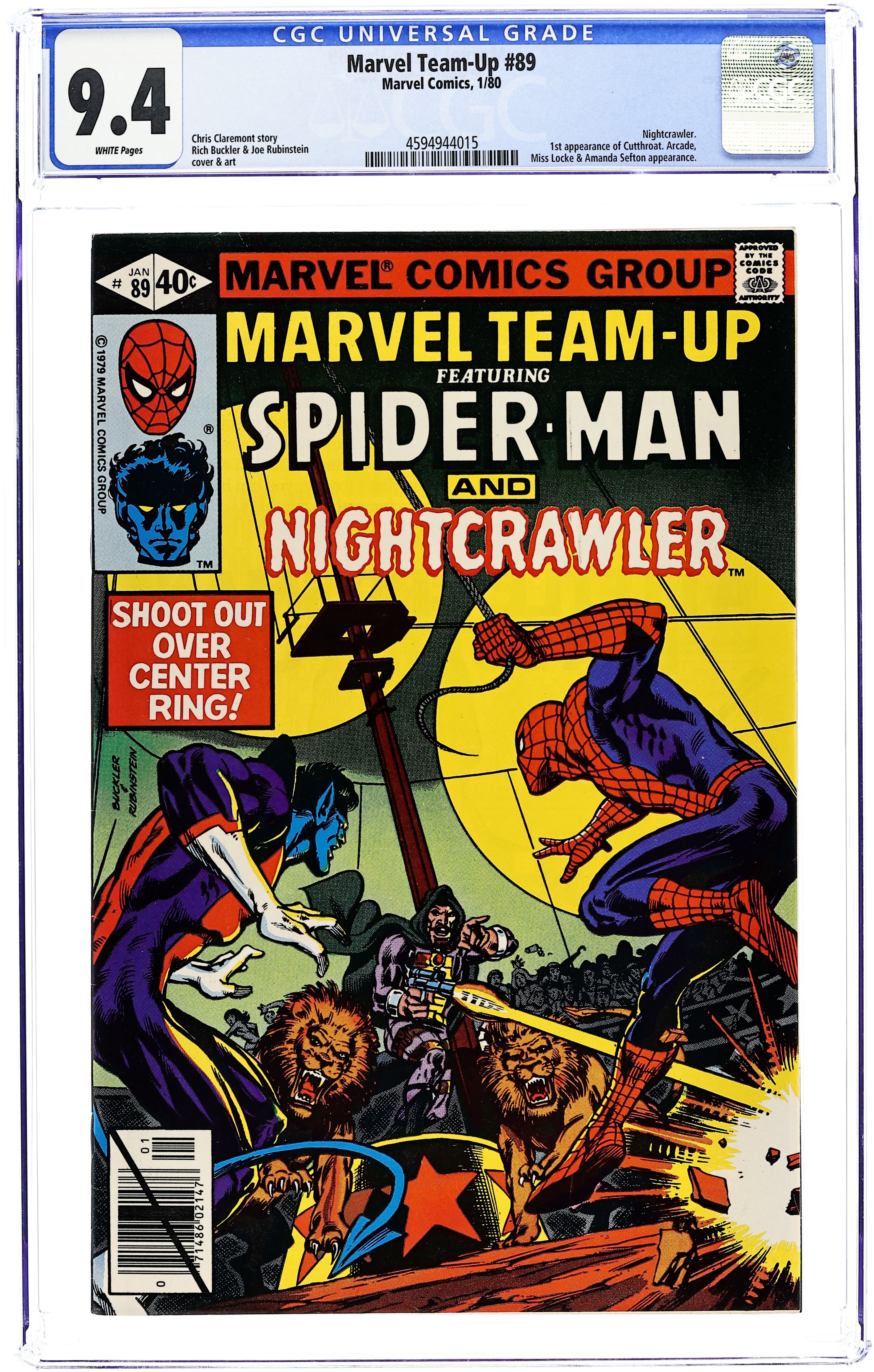 Ended Aug 4 2025 Bid History 9 bids Winning Bid $21 "Shoot Out Over Center Ring!" Guest-starring Spider-Man and Nightcrawler. Script by Chris Claremont. Pencils by Mike Nasser and Rich Buckler. Inks by Joe Rubinstein. Cover by Rich Buckler and Joe Rubinstein. While picking up Amanda Sefton at the airport, Kurt Wagner learns about a plot to kill Spider-Man at the World's Most Famous Arena! A cutthroat assassin lies in wait for the web-slinger at the circus inside Madison Square Garden! Will Nightcrawler dazzle the circus crowd one more time...and also save the wall-crawler? First appearance of Cutthroat. Cameo appearances by Arcade and Miss Locke. (Notes: This issue concludes Chris Claremont's run as the writer for the Marvel Team-Up title. This issue was reprinted in Marvel Tales 242.) 36 pages. Cover price $0.40. Grade: CGC 9.4 explanation of grade Condition: Used (collectible)